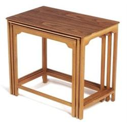 Edward Wormley nesting tables, by Dunbar, set of three, mahogany frames with woodgrain laminate tops, signed with rectangular green metal tag, original finish, largest: 22.5”w x 14”d x 19.25”h, very good condition