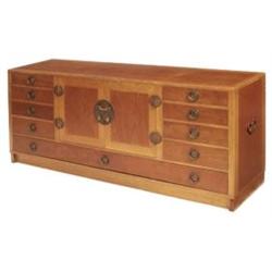 Edward Wormley sideboard, by Dunbar, 1960s, Asian-influenced form in walnut with two center doors flanked by eight drawers above one long drawer at bottom for linen storage, all with original brass hardware, glass-bottom serving tray to interior, signed, original finish, 69”w x 18”d x 28.25”h, very good condition