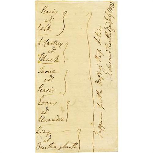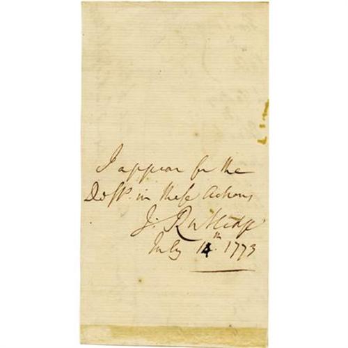 <B>Edward Rutledge and John Rutledge Autograph Notes Signed</B></I> "<I>Edward Rutledge</B></I>" and "<I>J. Rutledge,</B></I>" one on each side of the same 3.25" x 5.75" sheet. On one side, Edward Rutledge has penned five cases noting "<I>I appear for the Defts in these Actions/ Edward Rutledge July 14, 1773.</B></I>" On the other side, his older brother John Rutledge has penned "<I>I appear for the/ Defts in these Actions/ J. Rutledge/ July 14th 1773.</B></I>" Edward Rutledge, a signer of the Declaration of Independence,<B> </B></I>represented South Carolina in the Continental Congress from 1774-1776. John Rutledge, a signer of the Constitution, represented S.C. in the Continental Congress from 1774-1775 and 1782-1783. An Associate Justice of the first Supreme Court (1789-1791), he was nominated in 1795 to be Chief Justice and presided at the August term, but the Senate, on December 15, 1795, did not confirm him, primarily due to his outspoken opposition to Jay's Treaty of 1794. There is a narrow strip of glassine affixed at the lower edge of the "John" side with light show-through on the "Edward" side. Anything signed by both Rutledge brothers are scarce and desirable. <BR><BR><b>Shipping:</b> Flat Material, Small (<a target="_blank" href="http://www.heritageauctions.com/common/shipping.php">view shipping information</a>)