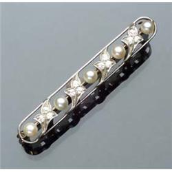 Edwardian 18-Karat Yellow Gold, Platinum Top, Diamond and Seed Pearl Bar Pin, Edward A. Stern Circa 1910 Set with twelve old mine cut diamonds weighing approximately .30 carats alternating with five seed pearls measuring 3.6 mm. Length: 2 in (5.1 cm) $300 - $400