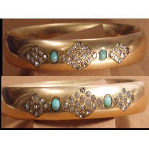 What an ornate Edwardian bracelet with its inset turquoise and rhinestone paste brilliants! The last photo shows one with diamonds that books for $3525.00 in the jeanenne bell book. You don?t see these with so many stones and detail work which really makes this special. This is heavy ( 32 grams) and is marked on the inside Cam & Co. The bracelet has a tiny hidden pin button that opens this bracelet. It measures ½" wide and is oval in shape. The width on the inside is 7 ½" long. IT tests at 9KT gold. Don?t miss out on this one at the last minute, it is a real treasure! No dings or dents on it either.