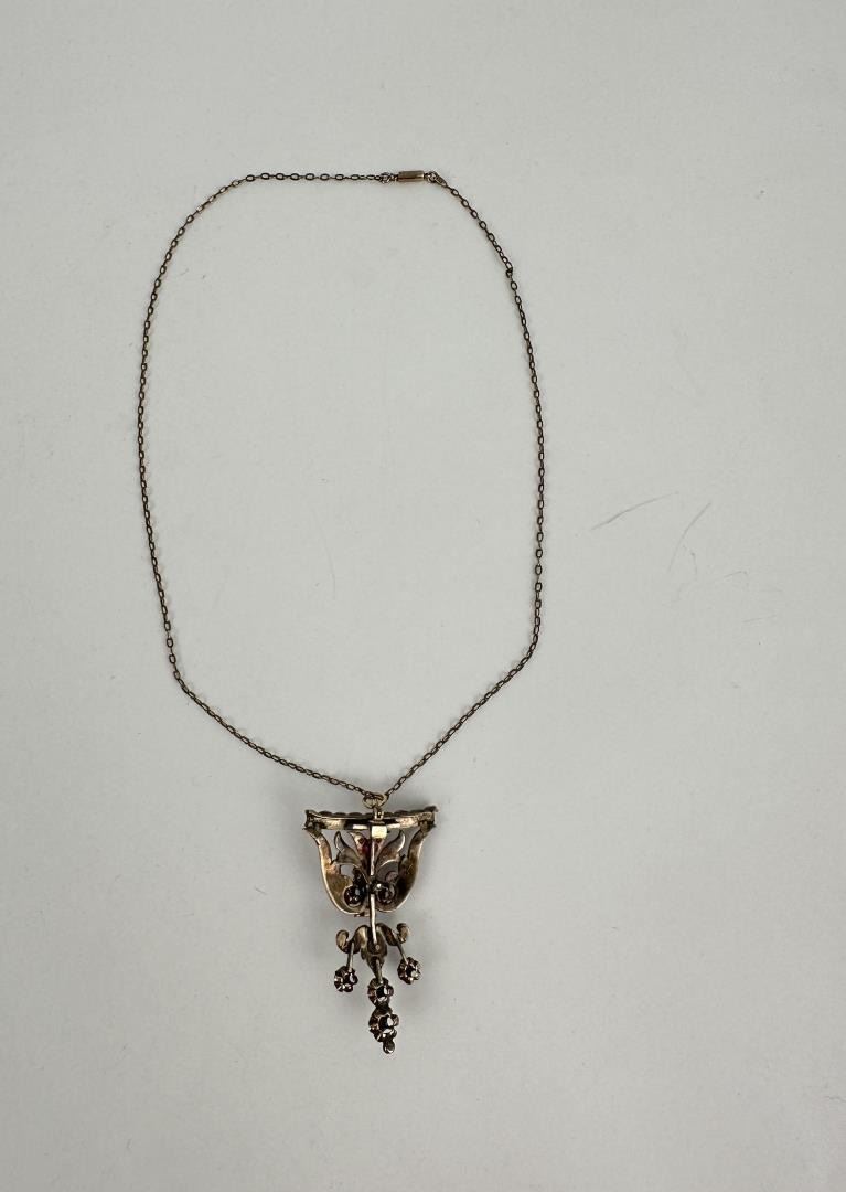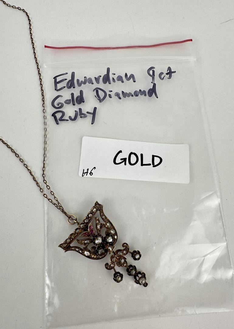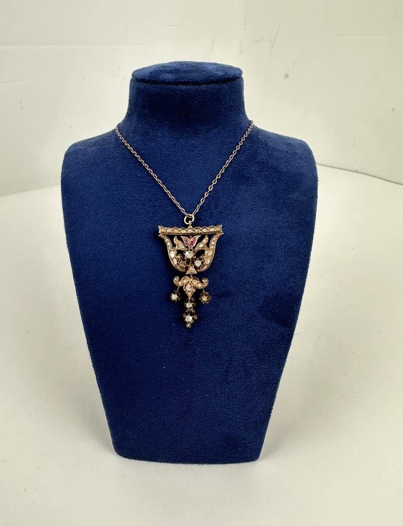 11.36 grams. Rose cut diamonds and rubies. 10 7/8" long.