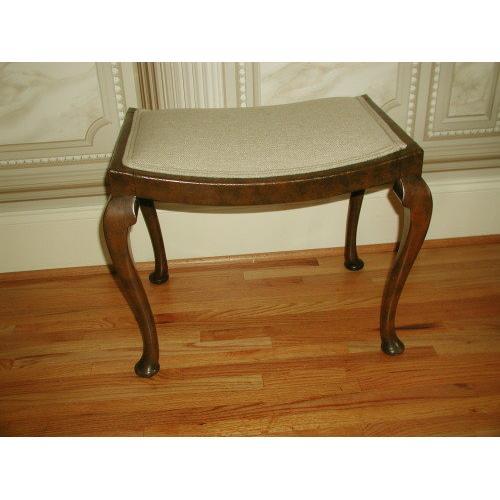 Edwardian C. 1900 walnut burl saddle type bench or stool is newly upholstered in the finest of taupe/camel linen with double welts surrounding the seat which is quite firm with new padding. Beautifully curved legs and feet and patina to the hand rubbed finish. Wonderful for vanity or extra seating in the living area. Minor wear to the two long edges by feel only in slight roughness yet all is the same color as the bench itself,no visible signs of nicks or scratches. Measures 21.5L X 18H X 15.5D.
