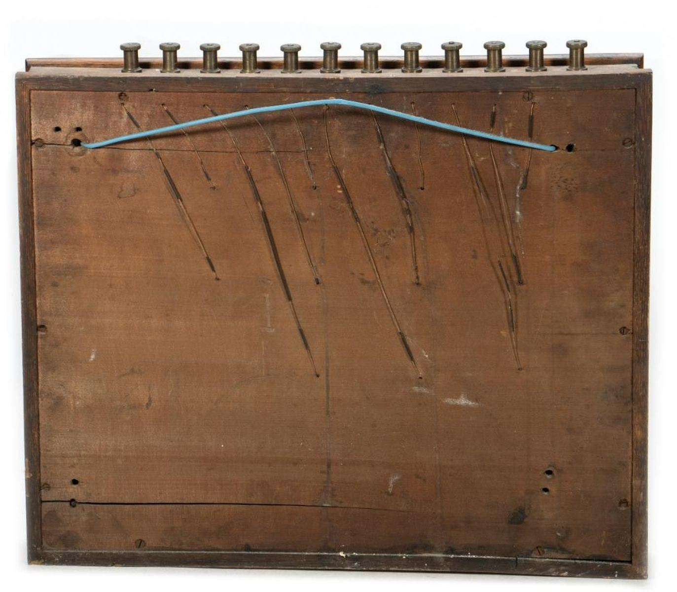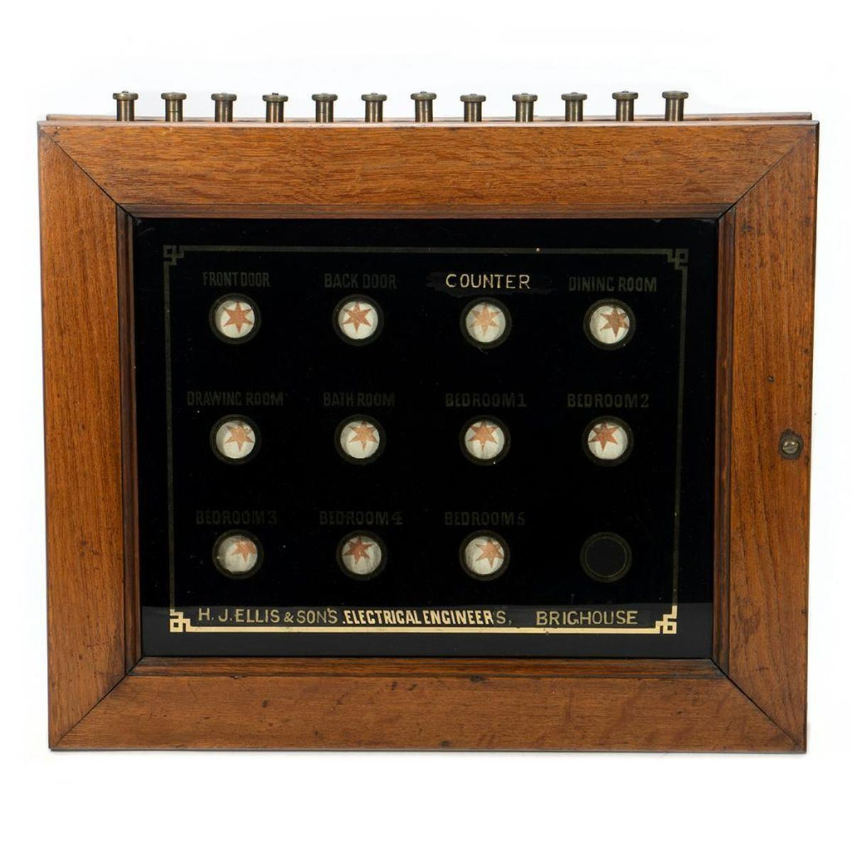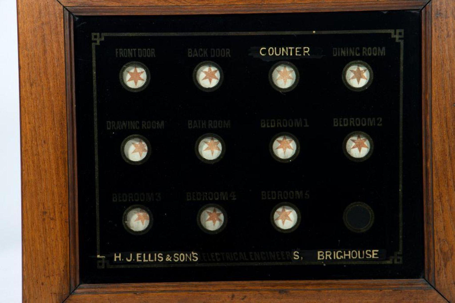 The box with eleven room flags. Made by H. J. Ellis and Son. Electrical Engineers, Brighouse. 19in. h. 16in. w. 3in. d.