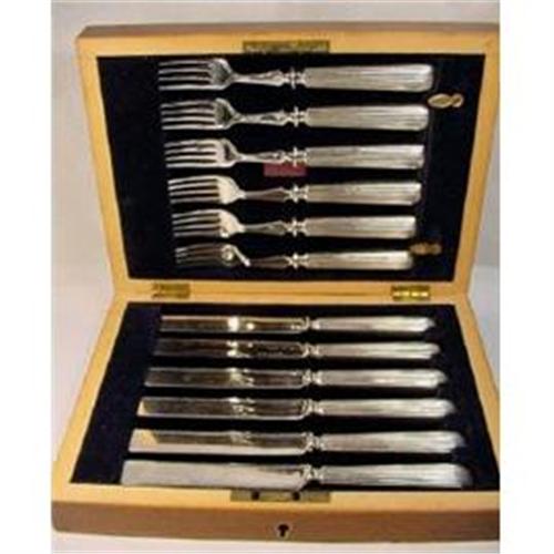 </font></strong>Silver plated set of 6 each fruit knives and forks - can be used for entree courses, or for fruit or other desserts. They come in their original box, with blank brass initial panel on the lid. Stamped with the maker?s mark of Levesley, Sheffield for the period 1875-1935. Handles are ribbed.
