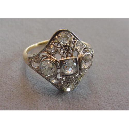 This is a 14K yellow gold and platinum diamond ring. There are thirteen prong set diamonds with a total weight of .70 carat. Clarity is SI2 and the color is H. The ring measures 5/8" by 3/4" at widest point. Circa 1900. Size 6 1/4