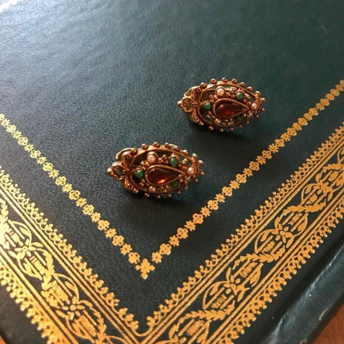 Antique Edwardian yellow gilt metal pinch-back type earrings with gemstone pastes & saltwater seed pearl accents. 20mm length XÂ 13mm W.Â