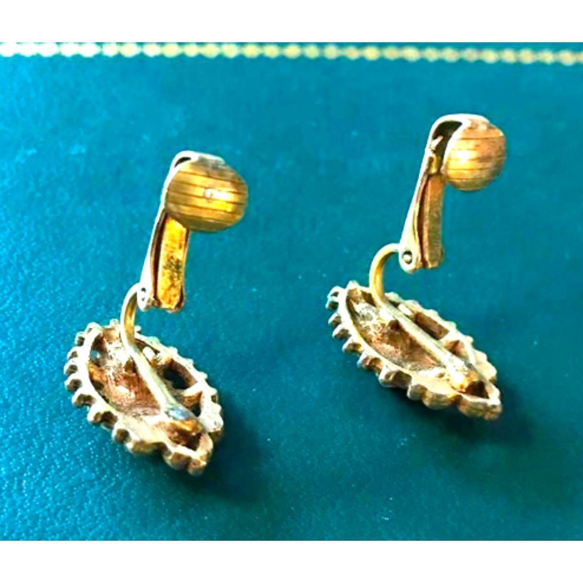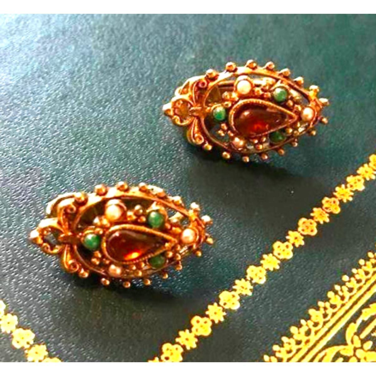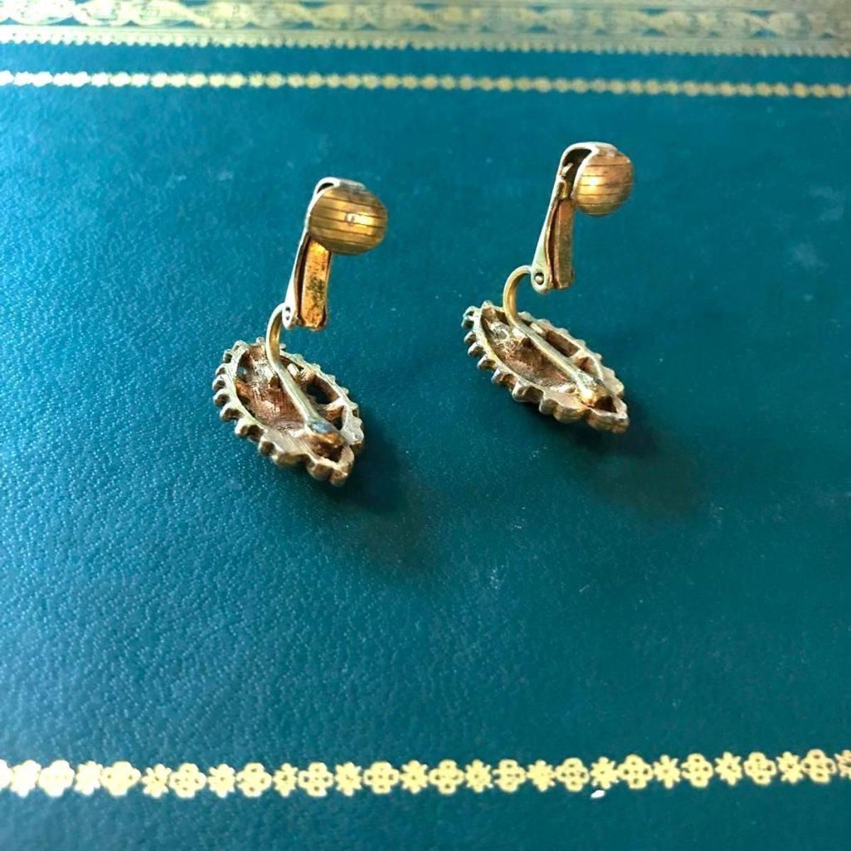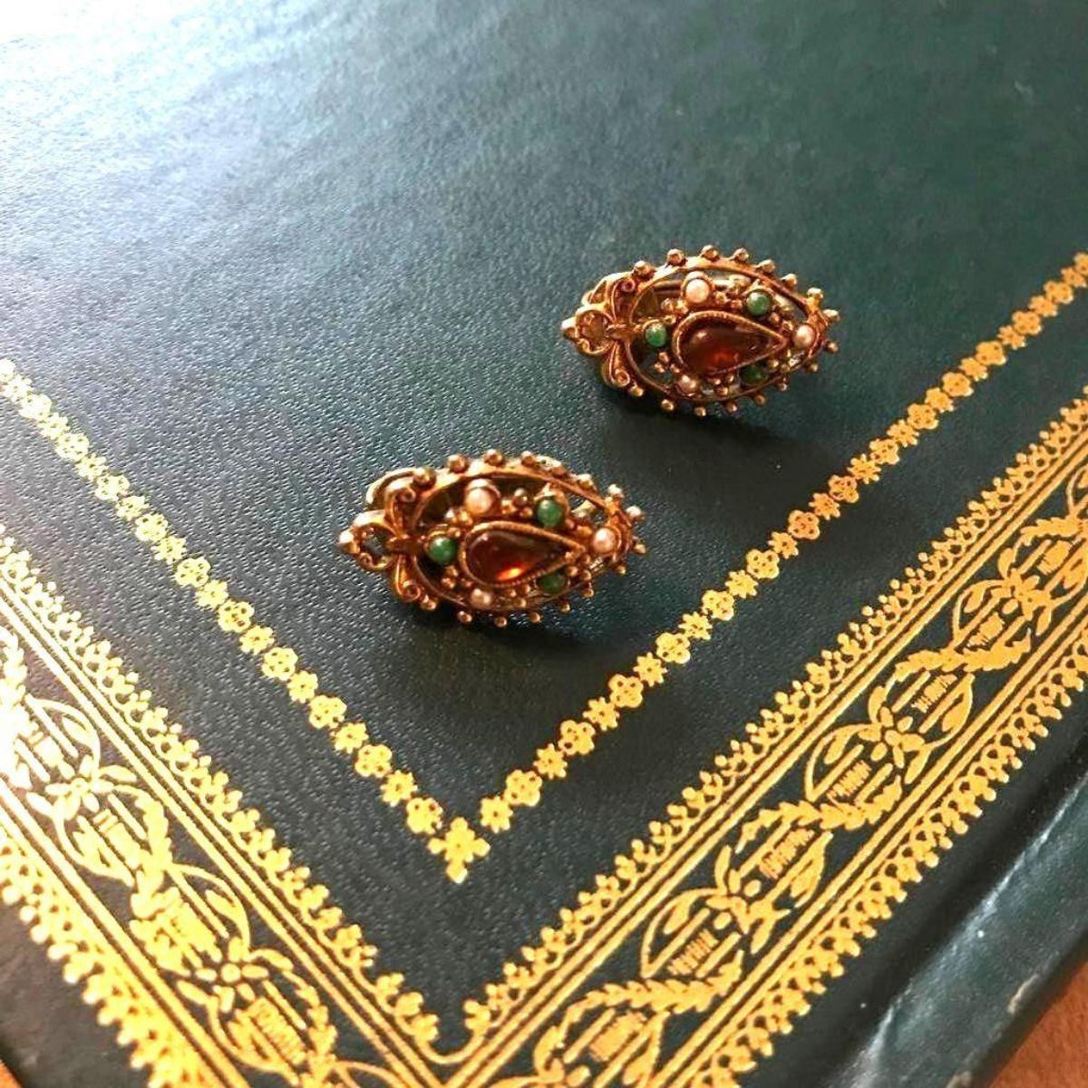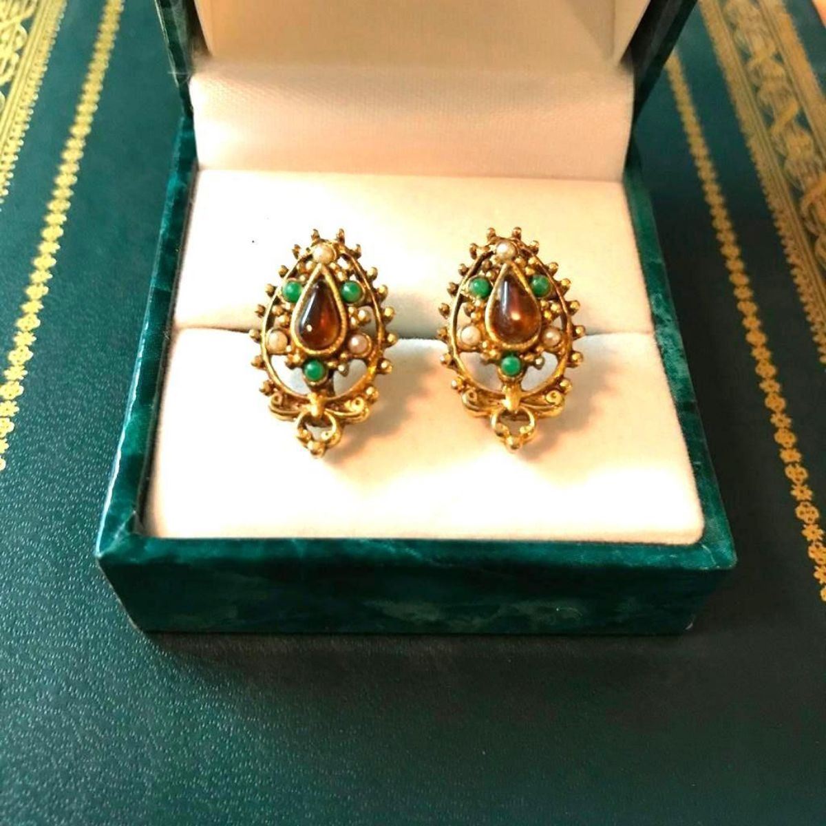 Antique Edwardian yellow gilt metal pinch-back type earrings with gemstone pastes & saltwater seed pearl accents. 20mm L XÂ 13mm W.Â