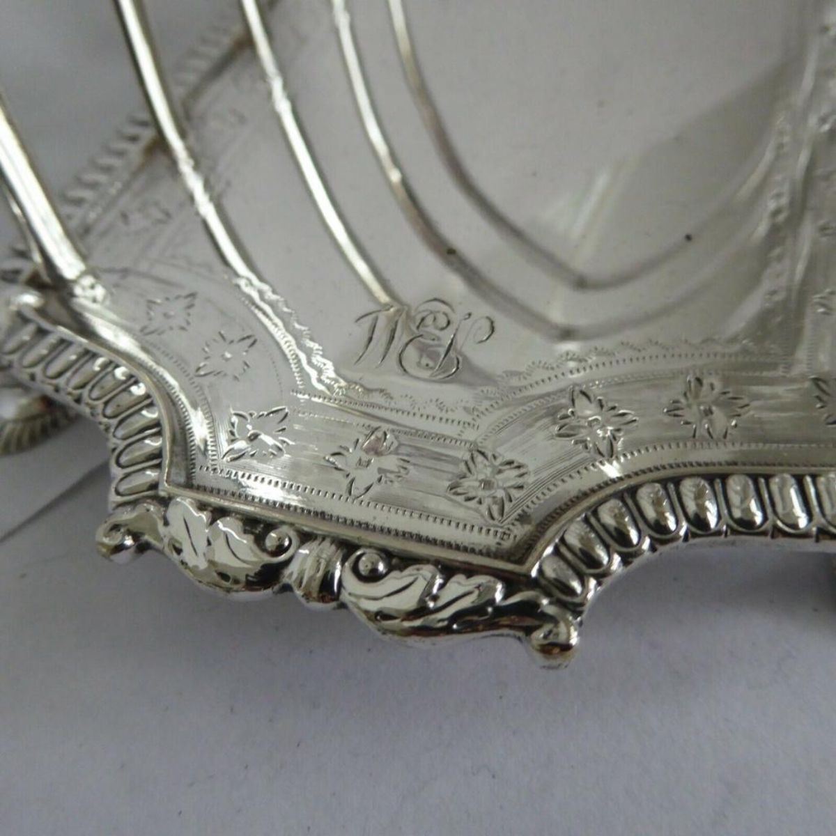 Edwardian silverplate, Gothic arched style, 5 bar footed toast rack with gadrooned border edge & chased detail. Stamped by famous silversmith Mappin & Webb. Small engraved, entwined initials to one end. 5 3/4" L X 6 1/4" H. 300 grams weight.