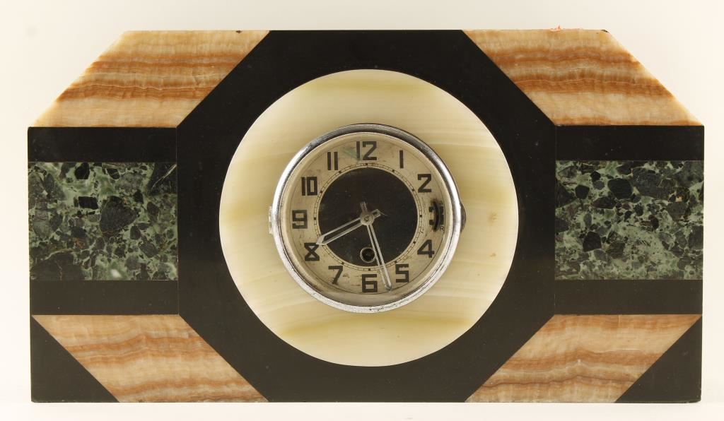 Black clock with marble inset design in separate pieces of green, rose, and ivory. Round clock face with glass cover that opens for winding. Not in working condition. Measures 18"x10"x3 3/4".
