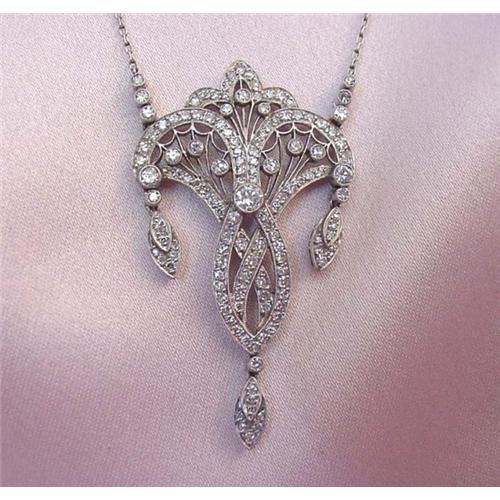 </font></strong>Gorgeous platinum diamond necklace from the Edwardian period. This necklace has a pierced scroll and web design with three Old European Cut diamonds and melee single cut diamonds set throughout. The(3)Old European Cut diamonds =.30 ct, VS1-VS2 clarity , and G-H color. The (123) single cut diamonds = 1.23 ct, VS2 clarity, and H-I color. The pendant measures 2" in length and 1 1/4" in width. The chain length is 17". The spring ring clasp is marked 750. Necklace weighs 8.6 grams. A great necklace in excellent condition!</font>