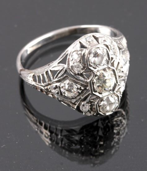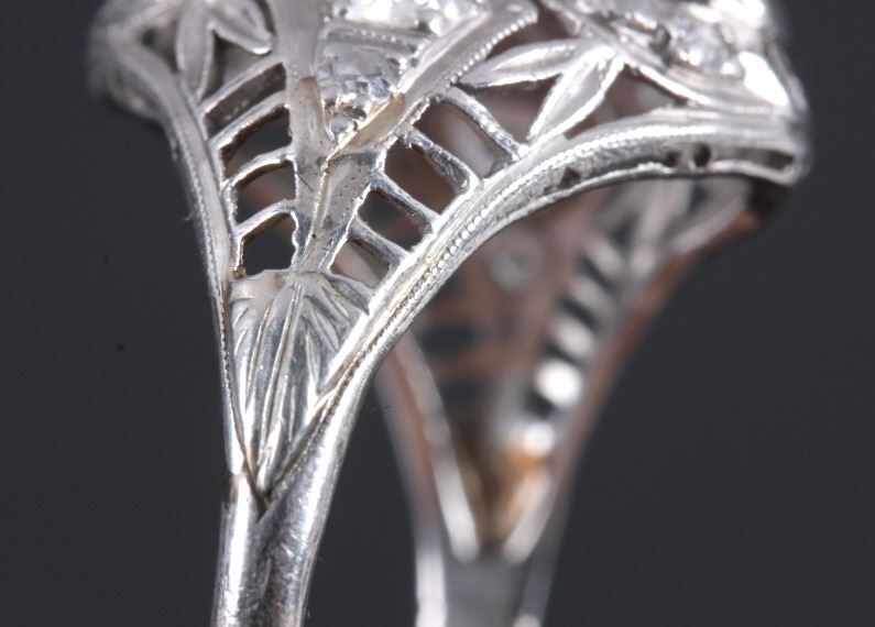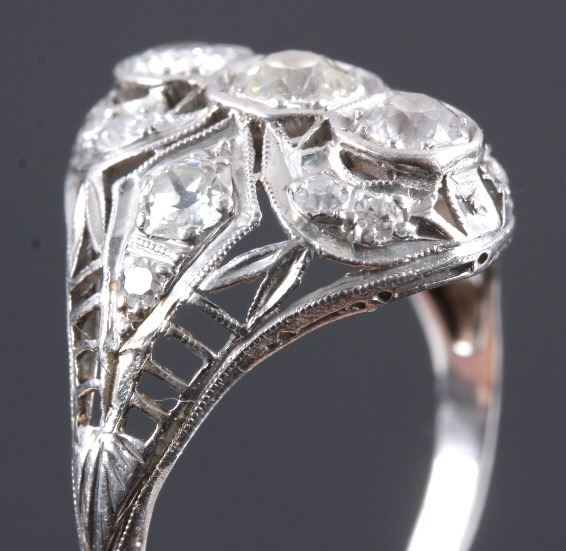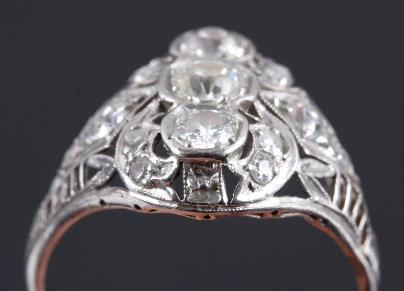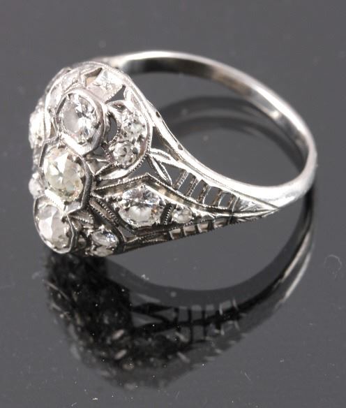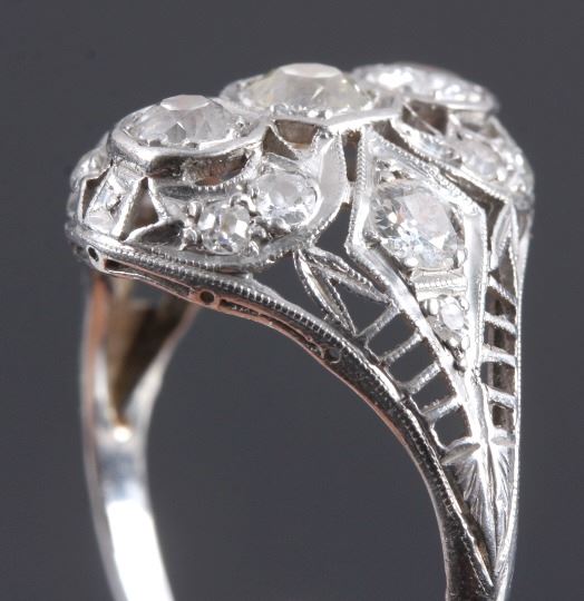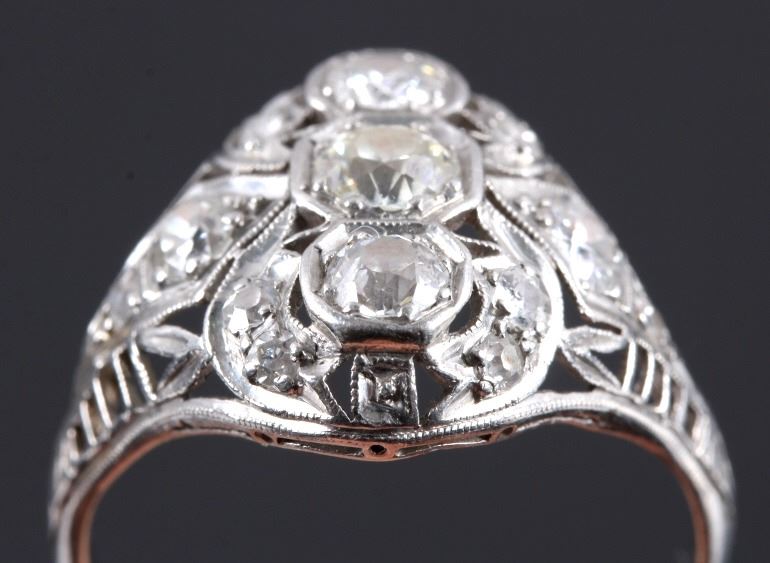 This is an excellent circa 1920s’ Edwardian ring showing a Platinum precious metal construction and over 1 carat total weight of excellent quality diamonds. The ring features three large diamonds in the center accented by six smaller diamonds on each side. The ring shows exquisite filigree craftsmanship and is in good condition. The ring is a size 9. The platinum and diamond have both been tested and are guaranteed to be authentic. Truly an excellent piece.