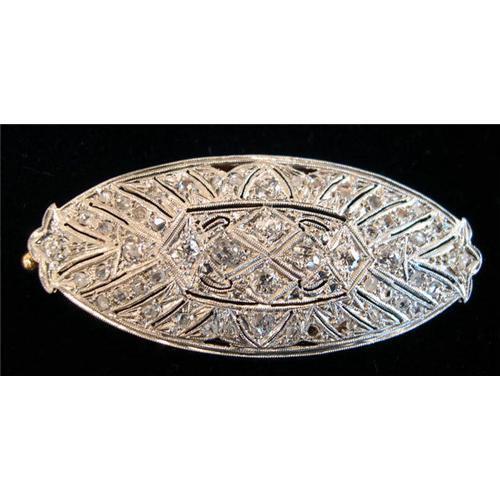 This is a platinum on 18K gold diamond Edwardian brooch. The brooch consists of a pierced top set with Old European cut diamonds in a geometric pattern. The twelve Old European cut diamonds have a total weight of 1.20 carats with an average clarity of SI1 and an average color of H-I. The 39 rose cut diamonds have a total weight of .50 carat. The brooch has a hinged straight pin back with side clutch closure. It measures 2" long by 7/8" in width. The workmanship is fine and the condition is excellent. Circa 1910.