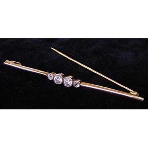 The pin is bezel set in platinum with four old European cut diamonds. The diamonds range in size, as follows: .32 carat, .36 carat and two .10 carat. The total weight is .88 carats. The GIA clarity grade is S/2 and the color is H-I. The top section of the bracelet is platinum with the original locking mechanism in 14 K yellow gold. The craftsmanship is fine and the condition is excellent. The pin is 3? in length. Circa 1901 - 1914. Note: Mounted gemstones are graded only to the extent that the mounting permits examination.