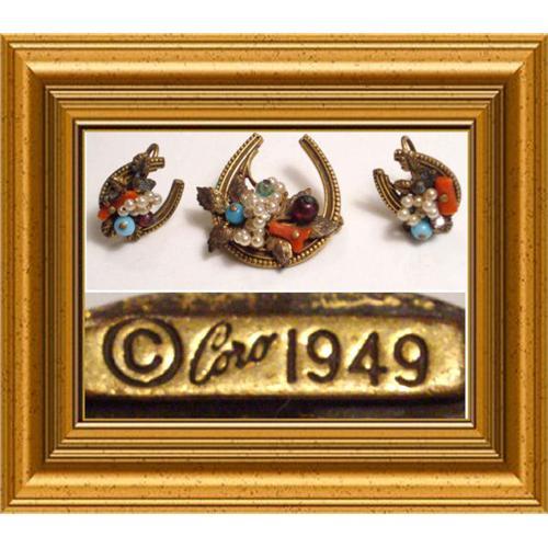 I don?t think I have seen many dated and signed Coro pieces, much less ones with real coral and so much detailing. These are very Edwardian with the seed pearls and turquoise. This is hand wired as well as having the layered soldered pieces. Haskell pieces look like this with the clusters of different types of jewelry components. This one has amethyst color glass, gilded leafs, pearls, turquoise, coral, and green glass. The victorian symbol of the horseshoe makes up the brooch and the screw back earrings. ALL the piece are signed. and the brooch is dated 1949. WONDERFUL collectors pieces!
