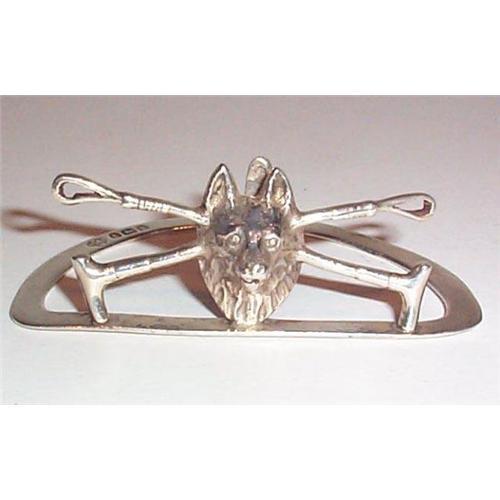 I have a pair of these to sell, each is priced separately (see 20755A for other).<p>Rare and highly collectible this antique sterling / solid silver menu holder features a fox head and two crossed riding crops.<p>Clearly hallmarked, this piece was assayed in Birmingham in 1907. <p>The silver column behind the fox's head is where the menu would sit. Perfect for the collector or entertainer alike!<p>Measures 2.5" wide x 2" deep x 1" high. Superb condition.