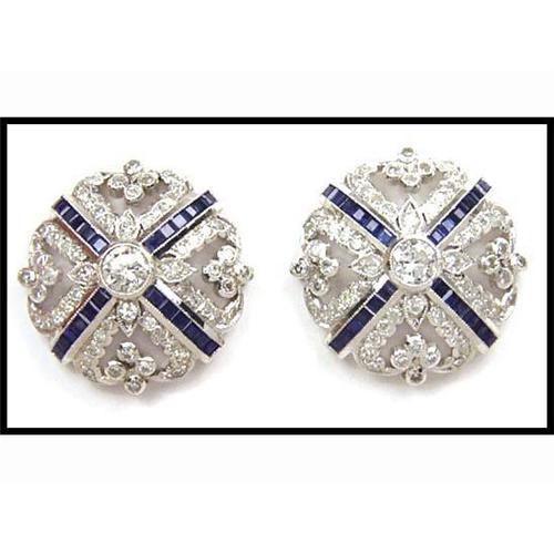 These 22mm (7/8") in diameter earrings exhibit workmanship that is equal to the finest of the fine.  18K white gold is highly detailed and set with 118 diamonds that total well over 1 3/4 carats or more.  The two larger stones total at least 2/3 carats. Fine blue natural sapphires create a stunning contrast. Total gross weight 10.7 grams.