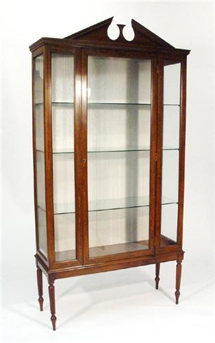 Edwardian inlaid mahogany china cabinet with broken pediment above a glazed door enclosing three adj