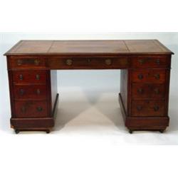 Edwardian mahogany twin pedestal desk, the top with moulded edge and tooled leather insert above an arrangement of nine drawers with brass ring handles on later castors, 150cm wide x 80cm deep x 79cm high