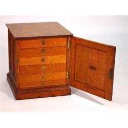 Edwardian oak collector's cabinet fitted a panelled door enclosing six graduated drawers with ring turned handles