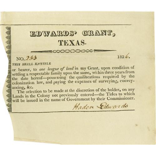 <B>[Edwards Grant]. Haden Edwards. Printed document completed in manuscript, signed by Haden Edwards.</B></I> N.p., [dated in manuscript September 4, 1826, but the printed year is 182_]. 1 p., 16mo. Certificate number 41. Provenance: Edwards family papers. "The interest and value of this document above and beyond its having been signed by Haden Edwards, lies in the fact that it is an apparently unknown imprint relating to Texas (needs more research). We feel that if Streeter had known of this item he would have listed it in his bibliography of Texas. Streeter mentions the colonization form for Austin colony and he also gives an entry for the other early impresario Leftwich (see Streeter 1087). Without further research it is difficult to ascertain where this grant form was printed. Streeter in his introduction has a sketch of printing in Texas and makes the comment "we know of no printing in Texas between July, 1823, and September, 1829." It seems unlikely that Edwards would have had the form printed in Mexico. Following the biographical chronology in Bancroft's Northern Mexico and Texas, it appears that Edwards was back in the United States during the summer of 1826. Perhaps he had these forms printed during that trip (Leftwich was back in the States in same time and his colonization form printed in Nashville)." - Dorothy Sloan. <I>Courtesy of J. P. Bryan, Houston.</B></I> <BR><BR><b>This 2006 March Texas State Historical Association Charity Auction is being held in Austin, TX on February 12 - March 4, 2006. This is a charity auction. All proceeds from donated lots in the auction, commissions from consigned lots, and the buyer's premium go solely to the Texas State Historical Association. The floor auction session is by invitation only. Online bidding ends March 3, 2006 at 10:00PM CT. Your secret maximum bid will compete for you during the floor auction, and it is possible that you may be outbid on the floor after internet bidding closes. The applicable buyer's premium for this auction is an amount equal to 15% (minimum $9 per lot) of the successful bid on ebay. State law requires lots consigned (not donated) to THSA collect full sales tax on items that sell for a total of $5,000 or more. </b>