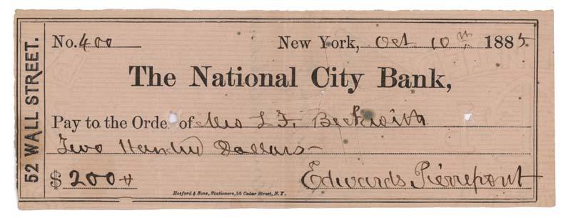 1885, New York. Partly printed check payable to Mrs. L.F. Beckwith in the amount of $200.00. 7"" x 2"" Accommplished in his hand and signed by EDWARDS PIERREPONT(1817 - 1892). Lawyer; U. S. Attorney General; Ambassador. Cut and punchcancellations not affecting signature. Fine.