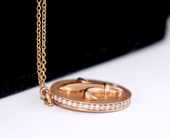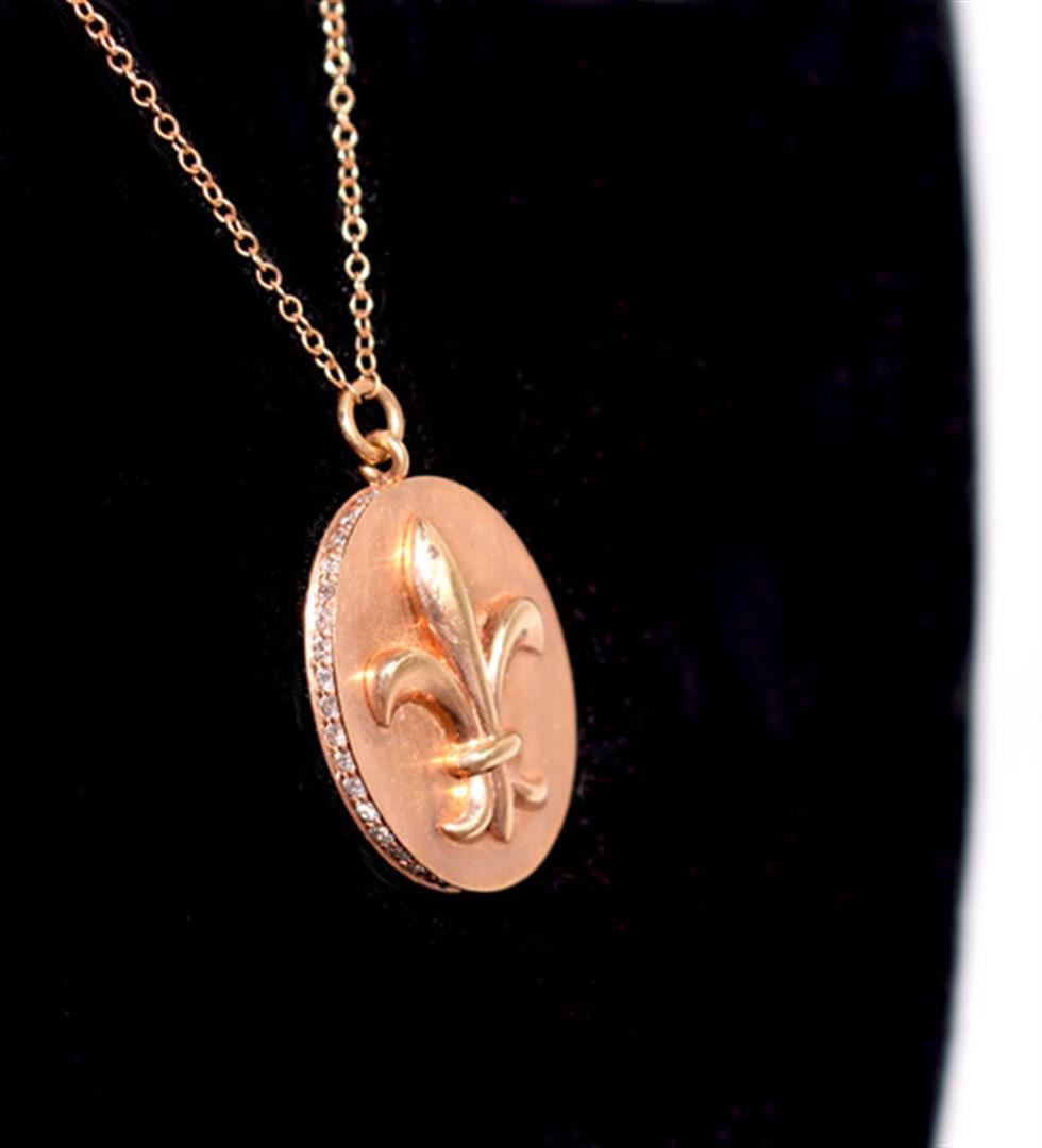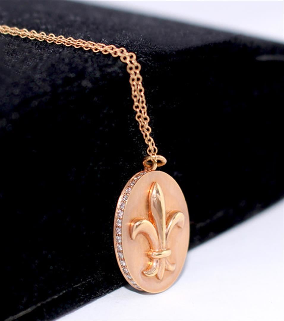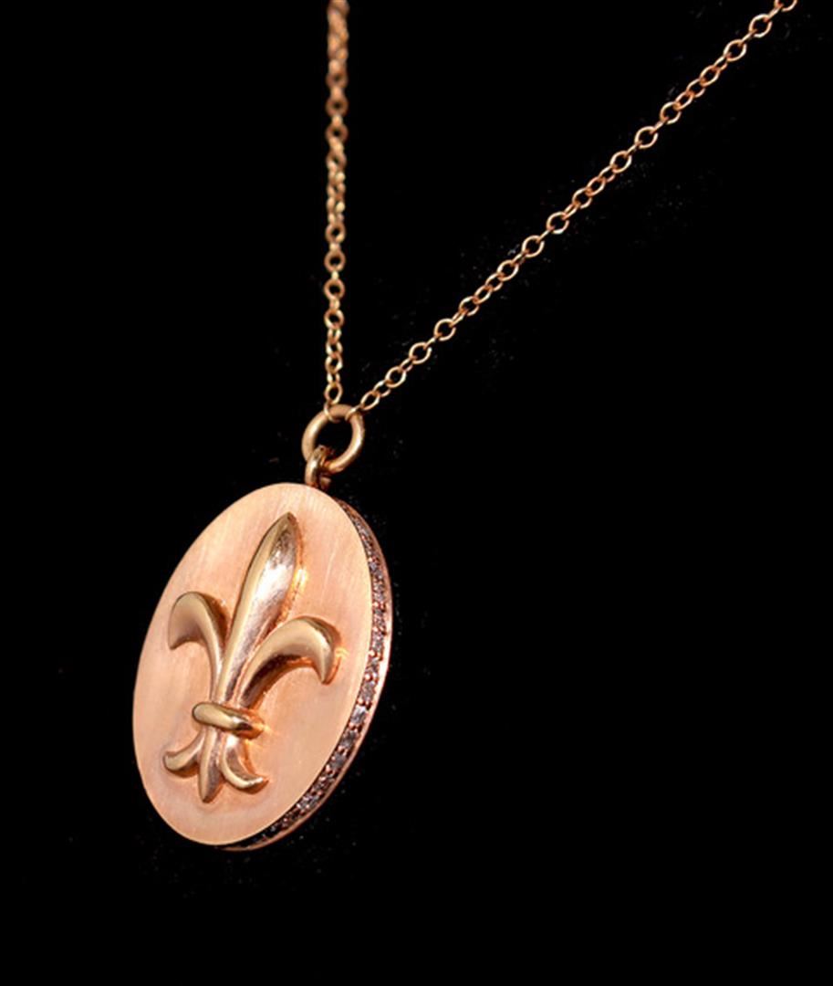 Edwards and Rellas Sur Le Bord Collection. 18k Rose Gold with 1.00 CTW of G VS1 RBC diamonds Fleur Di Lys pendant necklace Weight: 8.8 grams -Measurements: 15 mm x 20 mm chain 18 inch