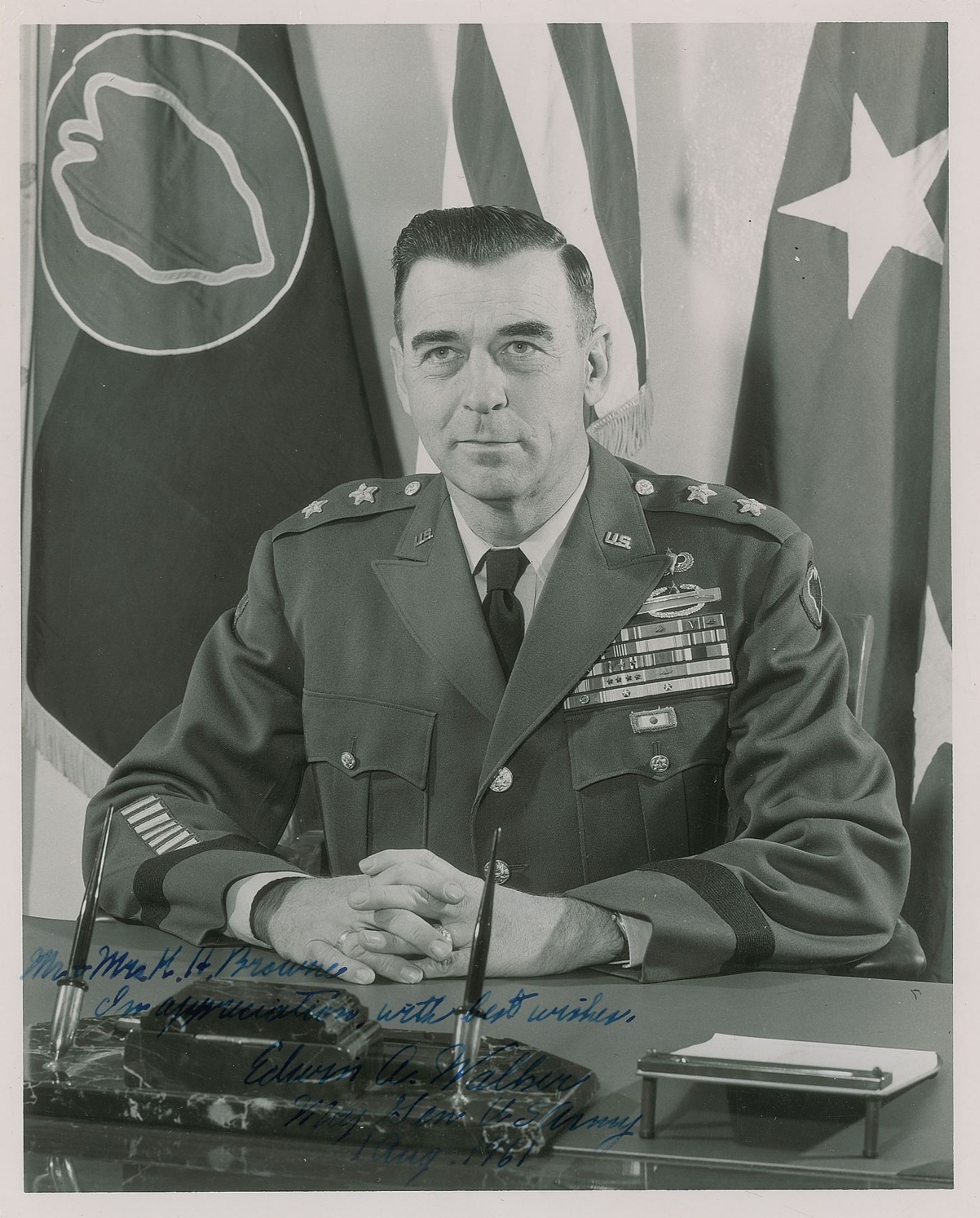 Highly decorated United States Army officer (1909–1993) who fought in World War II and the Korean War, remembered as the target for an assassination attempt by Lee Harvey Oswald in April 1961. Vintage glossy 8 x 10 photo of Walker in uniform, signed and inscribed in fountain pen, "Mr. & Mrs. K. H. Browne, In appreciation, with best wishes, Edwin A. Walker, Maj. Gen. U.S. Army, 1 Aug. 1961.” Reverse bears an "Official U.S. Army Photograph" stamp and collector's annotation indicating that it was received in August 1961. In very good to fine condition, with scattered light creasing.