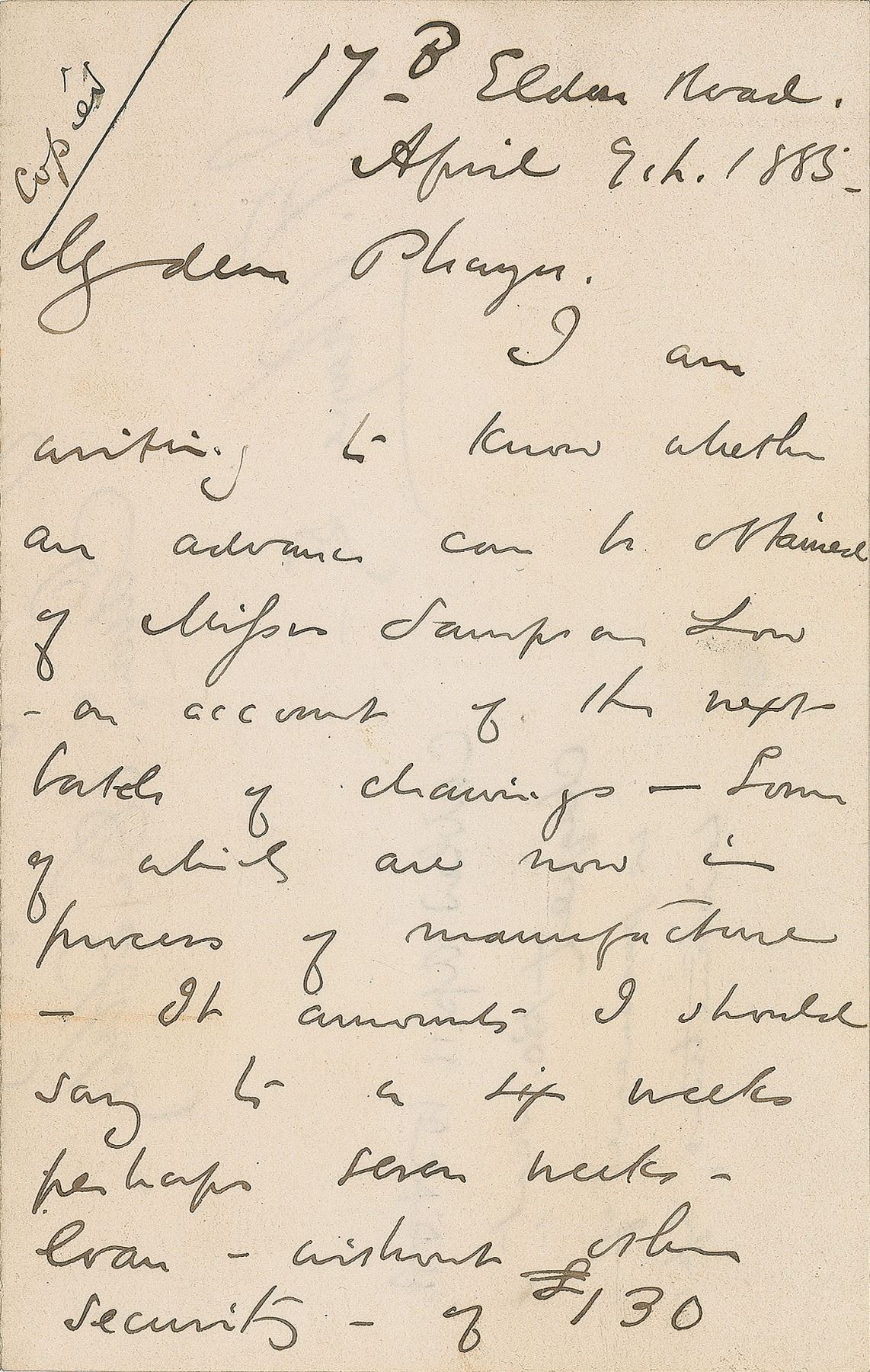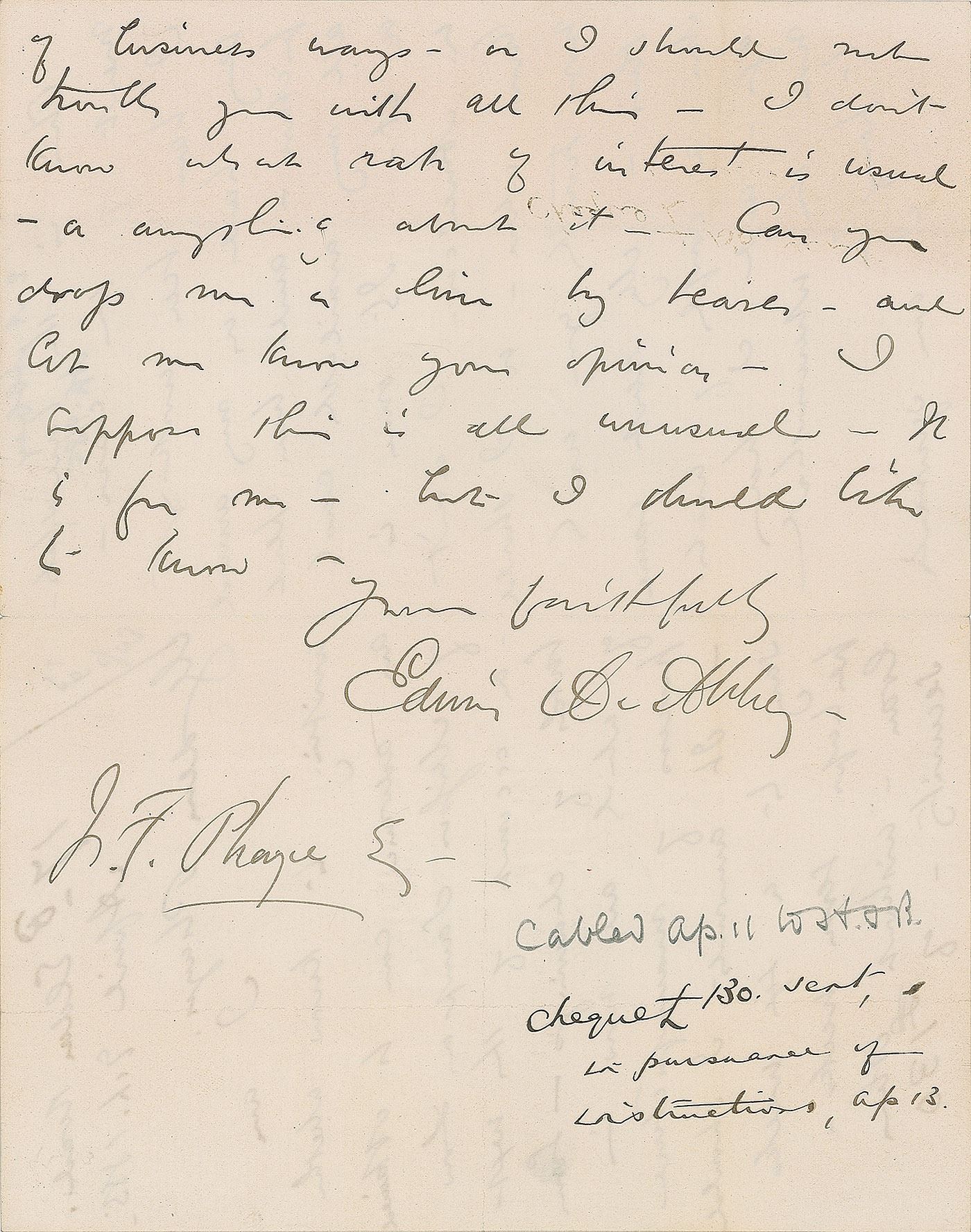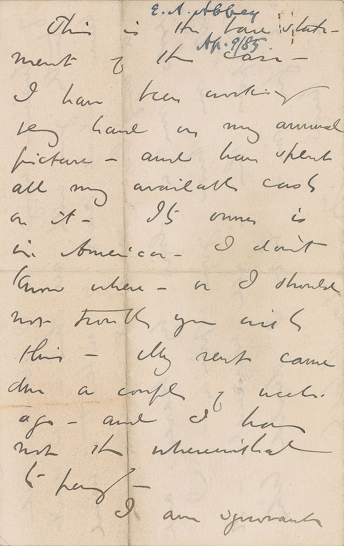 American muralist, illustrator, and painter (1852–1911) who is best known for his drawings and paintings of Shakespearean and Victorian subjects, as well as for his painting of Edward VII's coronation. His most famous set of murals, The Quest of the Holy Grail, adorns the Boston Public Library. Scarce ALS signed “Edwin A. Abbey,” three pages on two adjoining sheets, 4.5 x 7, April 9, 1885. In part: "I am writing to know whether an advance can be obtained of Missr. Sampson Low—on account of the next batch of drawings—some of which are now in process of manufacture—It amounts I should say to a 4 weeks perhaps seven weeks…of £130…I have been working very hard on my annual picture—and have spent all my available cash on it. Its opening is in America. I don't know where—or I should not bother you with this—My rent came…a couple of weeks ago—and I have not the wherewithal to pay." In fine condition.