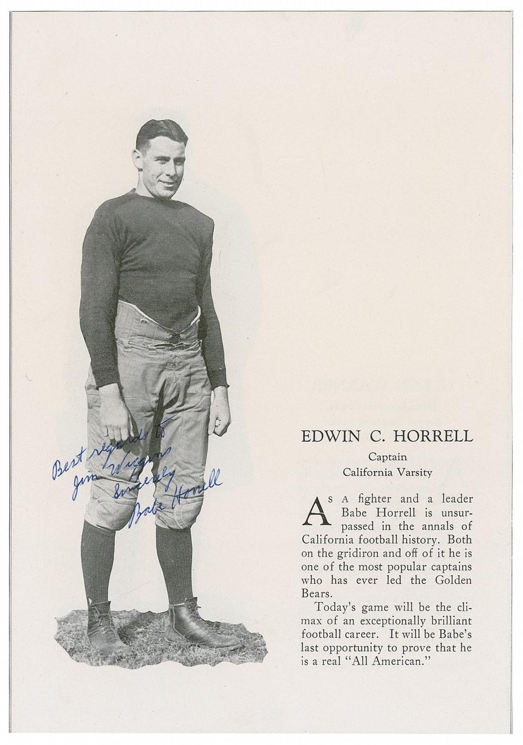 College Football Hall of Famer (1902–1992) who played for California. Trimmed 6.25 x 9.25 book photo, signed and inscribed in blue ballpoint “Best regards to Jim Wiggins, Sincerely, Babe Horrell.” In fine condition.