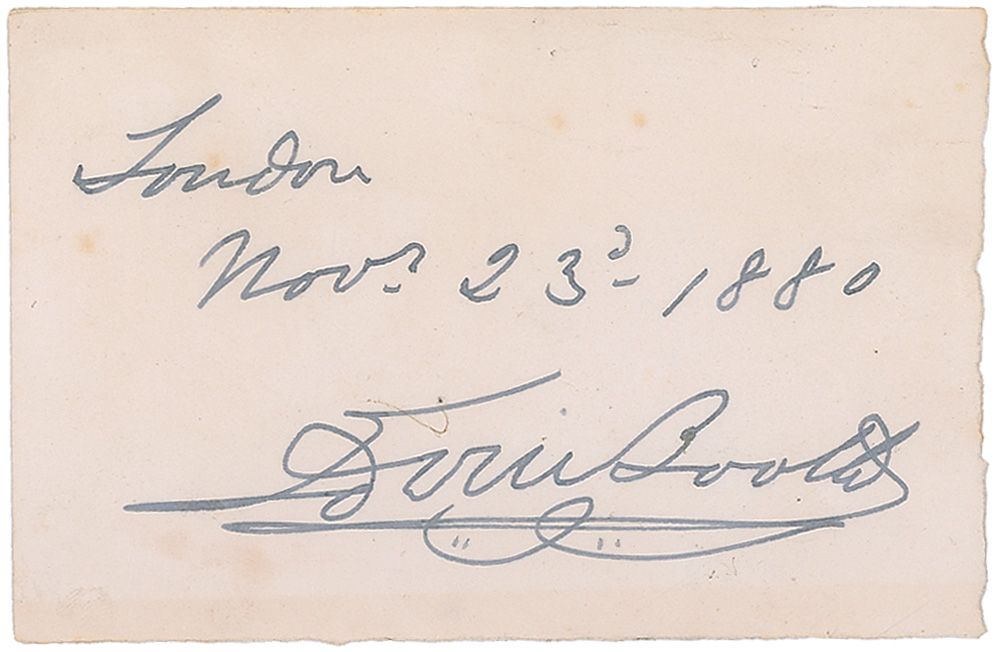 Renowned American Shakespearean actor (1833–1893) and brother of Lincoln assassin John Wilkes Booth. Vintage ink signature, “London, Nov. 23d 1880, Edwin Booth,” on an off-white 3.5 x 2.5 slip. In fine condition, with a few spots of foxing and a couple light surface impressions. Accompanied by a period engraving of Booth.
