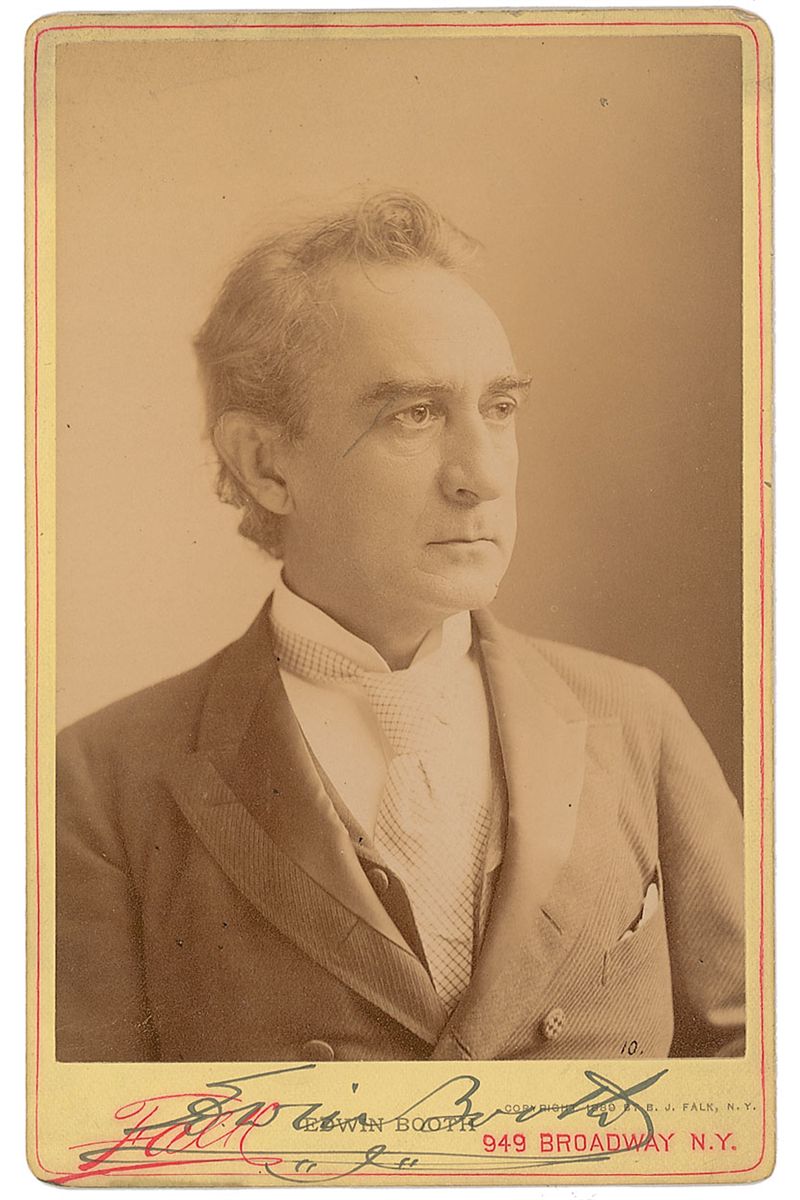 Renowned American Shakespearean actor (1833–1893) and brother of Lincoln assassin John Wilkes Booth. Uncommon original 4.25 x 6.5 cabinet photo of Booth in a corduroy suit, neatly signed on the mount in black ink. Published by B. J. Falk of New York. In fine condition, with a noticeable surface mark near his eye.