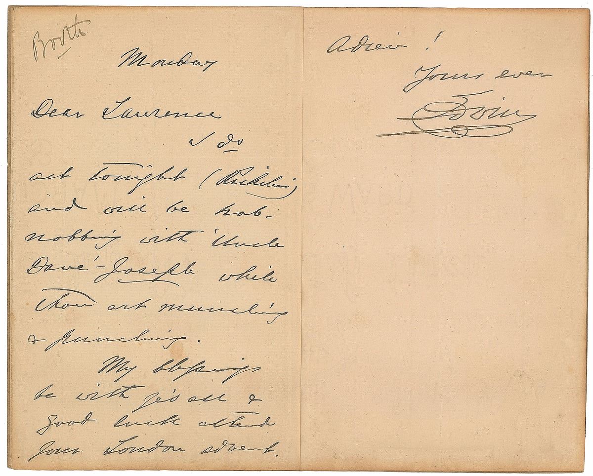 ALS signed “Edwin,” two pages, 5 x 8, no date. Letter regarding a performance, in part: “I do act tonight (Richelieu) and will be hob-nobbing with ‘Uncle Dave’—Joseph while thou art munching & punching.” Affixed side-by-side to a heavy piece of cardstock. In very good to fine condition, with light overall rippling.