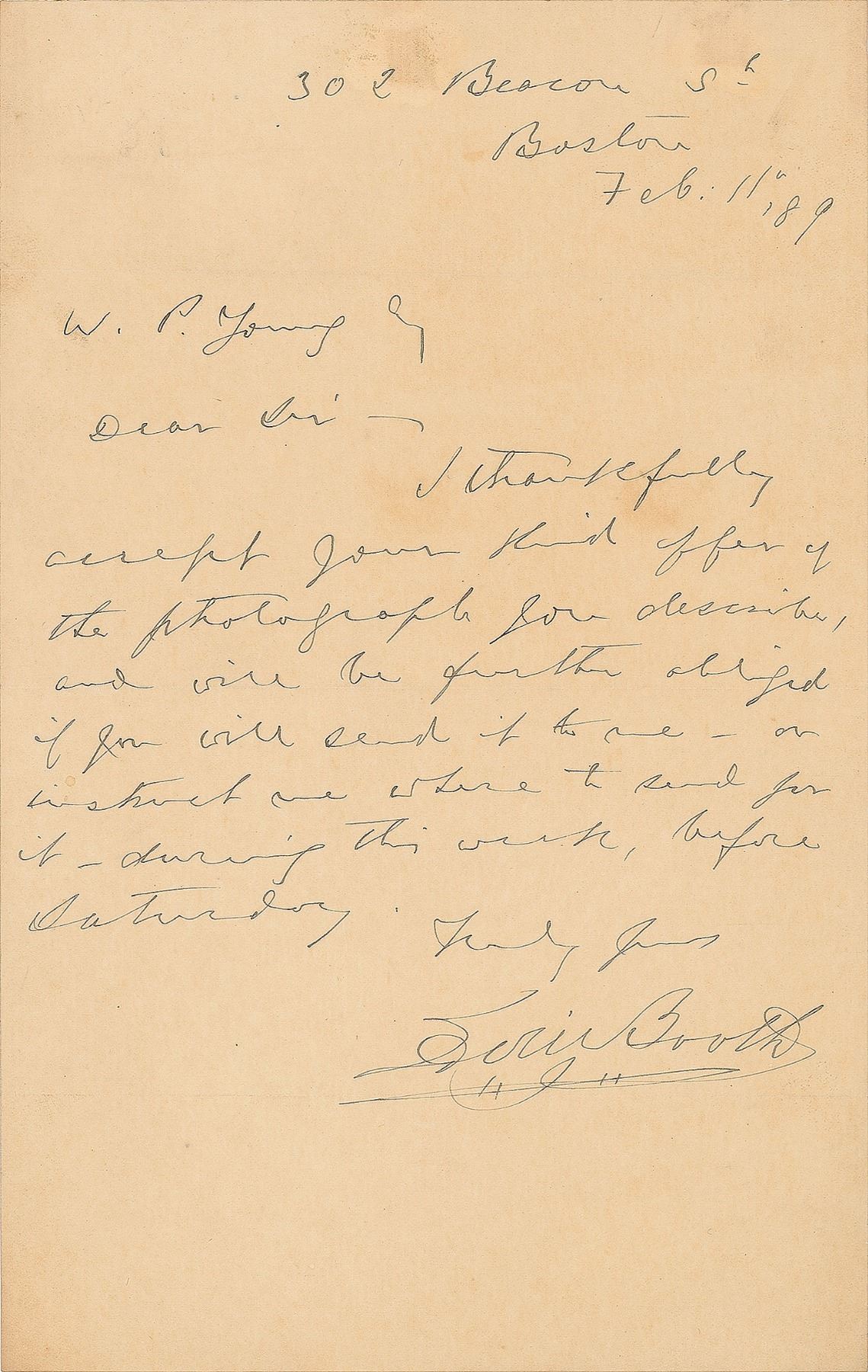 Renowned American Shakespearean actor (1833–1893) and brother of Lincoln assassin John Wilkes Booth. ALS, one page, 5.25 x 8.5, February 11, 1889. Letter to W. P. Young, in full: "I thankfully accept your kind offer of the photograph you describe, and will be further obliged if you will send it to me—or instruct me where to send for it—during this week, before Saturday." In fine condition, with light show-through at the top edge from two small pieces of tape on the reverse.