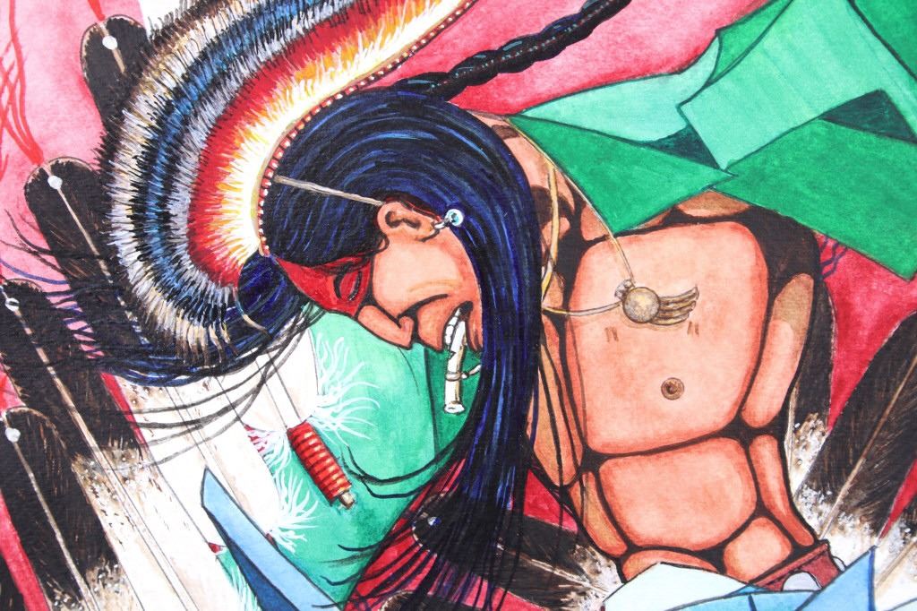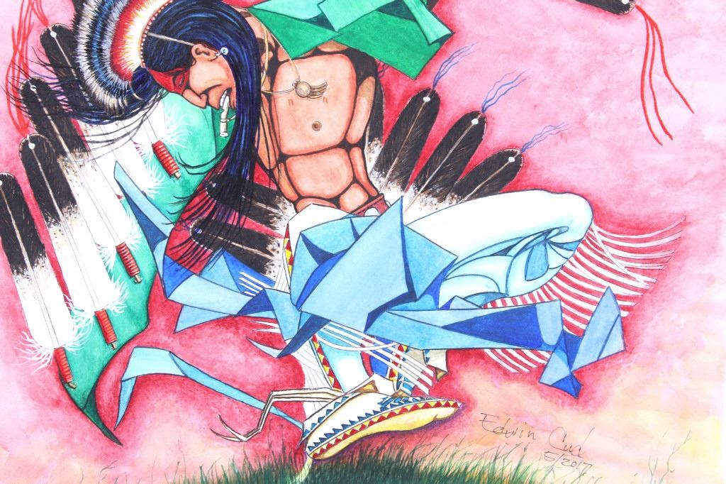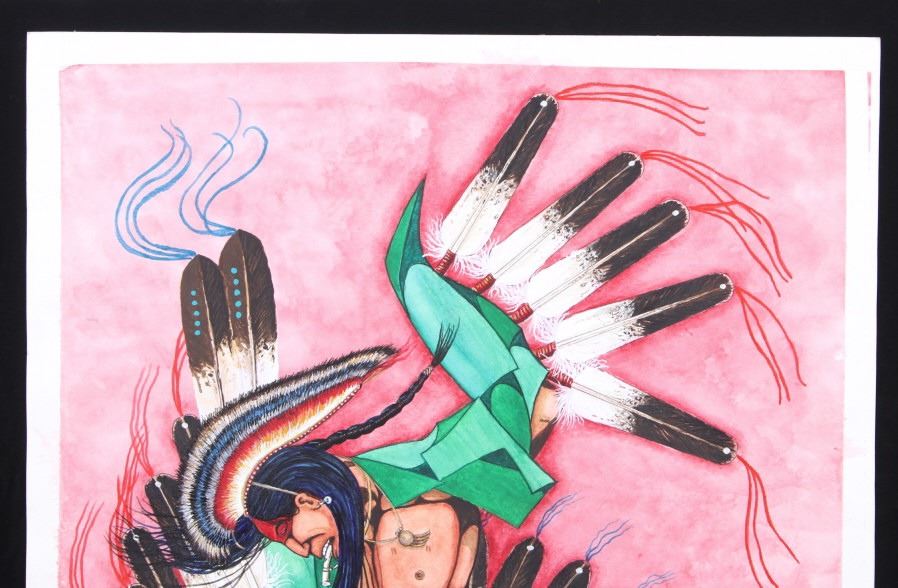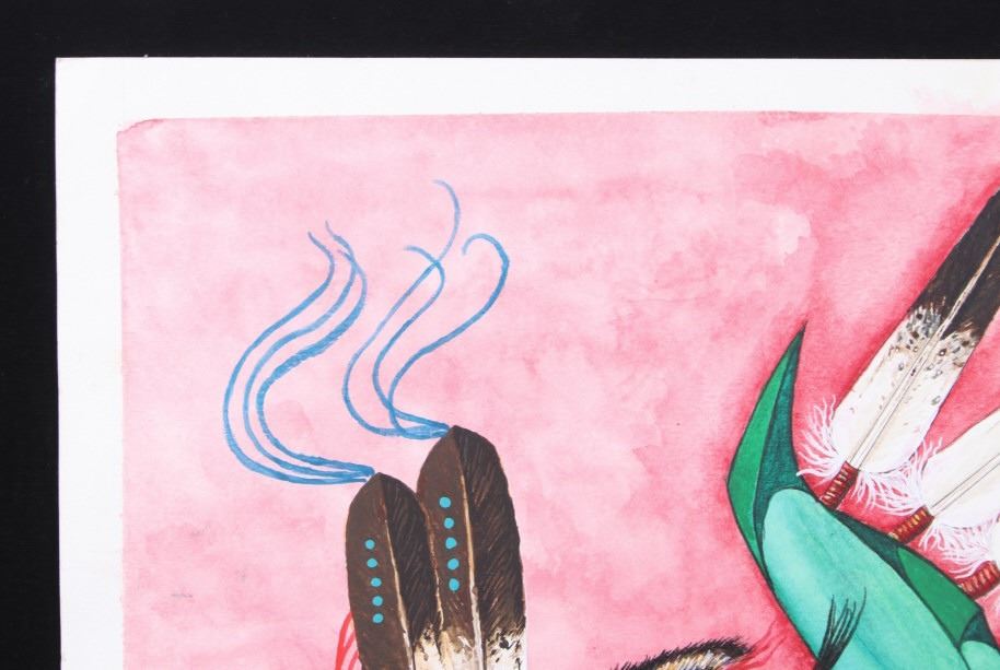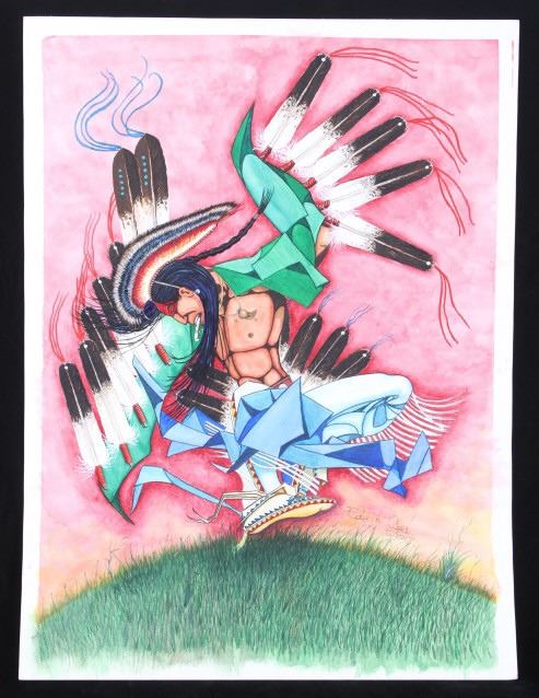 Featured in this lot is this gouache on paper of a ceremonial Native dancer by artist Edwin Cud circa 2017. The artwork is wonderfully and professionally crafted gouache on paper construction that features a mixed media scene of a Native man dressed in ceremonial garments and painted to a watercolor sunset scene in the distance and shown above a grassy hill. The artist signature can be seen in the bottom right hand corner along with the date "Edwin Cud," "5/2017." The condition of this gouache is good with no obvious signs of damage and shows good overall condition. The measurements of this art measures 24" x 18".
