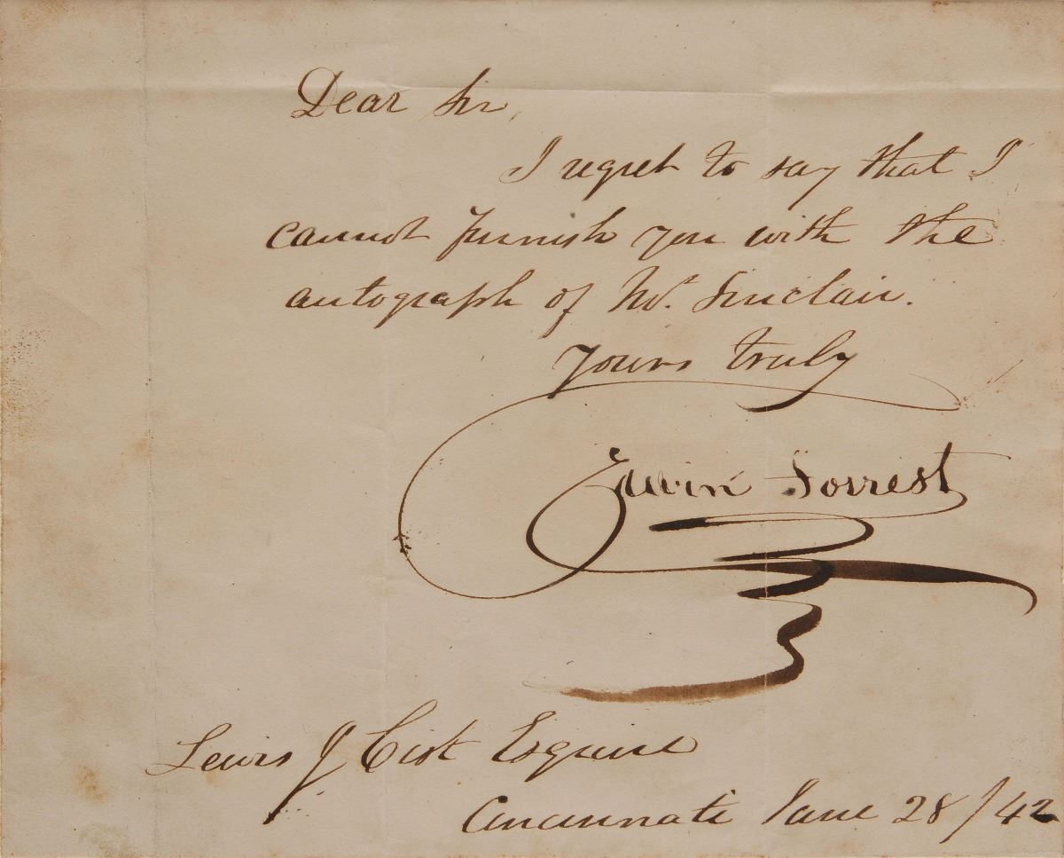 Nineteenth-century American Shakespearean actor (1806–1872) whose feud with British actor William Charles Macready caused the deadly Astor Place Riot of 1849. Uncommon ALS, one page, 6.75 x 5.5, June 28, 1842. Letter to Lewis J. Cist, in full: “I request to say that I cannot furnish you with the autograph of Mr. Sinclair.” In very good to fine condition, with light overall soiling. Accompanied by the original wax-sealed mailing envelope, addressed in Forrest’s own hand.