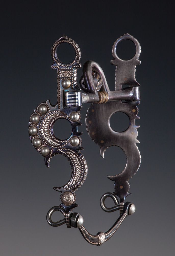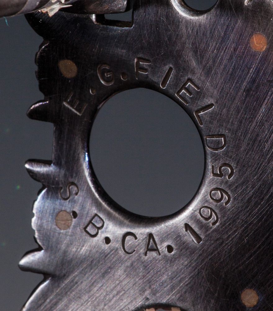 Edwin George Field Bit. Classic E.G. Field (1920-2012) maker-marked Santa Barbara, Calif silver inlaid and stamped half-breed bit dated 1995. Unused condition, retaining 99% of the original bluing. PROVENANCE: Dick Powell Collection, Casa Grande, Arizona.