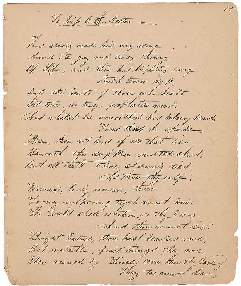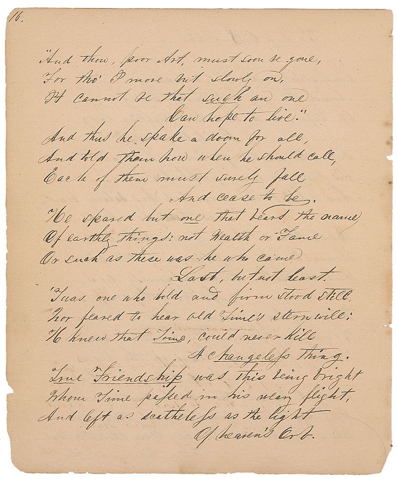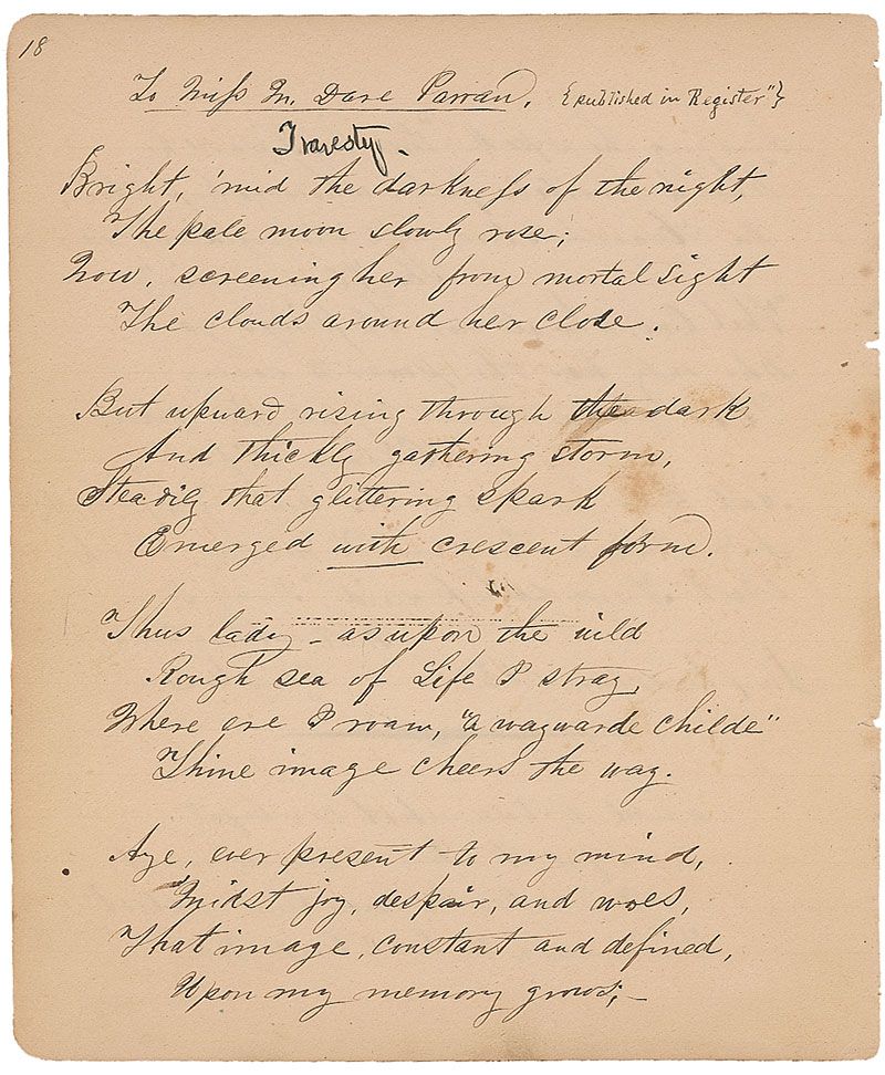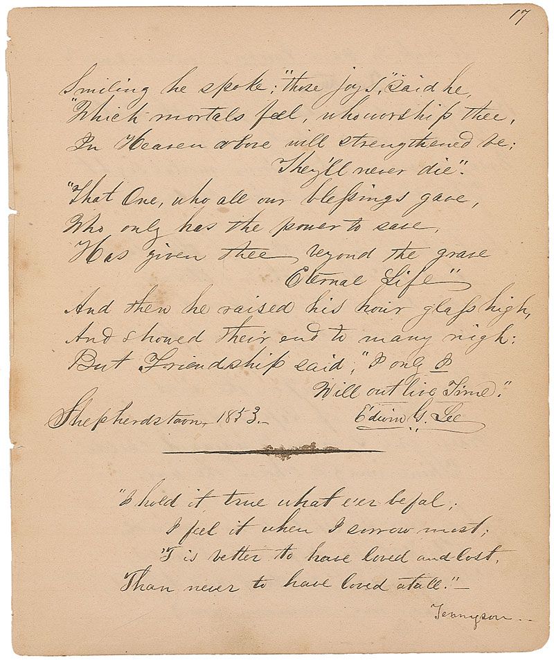 Confederate brigadier general during the Civil War (1836–1870). He was a member of the Lee family and first cousin once removed of Robert E. Lee. Two original handwritten poems, both one page, both sides, 6 x 8, one signed at the conclusion, “Edwin G. Lee,” and dated 1853. First poem is inscribed “To Miss E. F. Bocter,” and begins “Time slowly made his way along / Amid the gay and busy throng / Of Life, and this his blighting song / struck terror deep.” Second poem is inscribed to “Miss M. Dane. Parran,” is entitled “Travesty,” and begins: “Bright ‘mid the darkness of the night / The pale moon slowly rose; / Now, screening her from mortal sight / The clouds around her close.” At the conclusion of the second poem, Lee adds a verse from Tennyson. In fine condition, with uniform toning to each page.