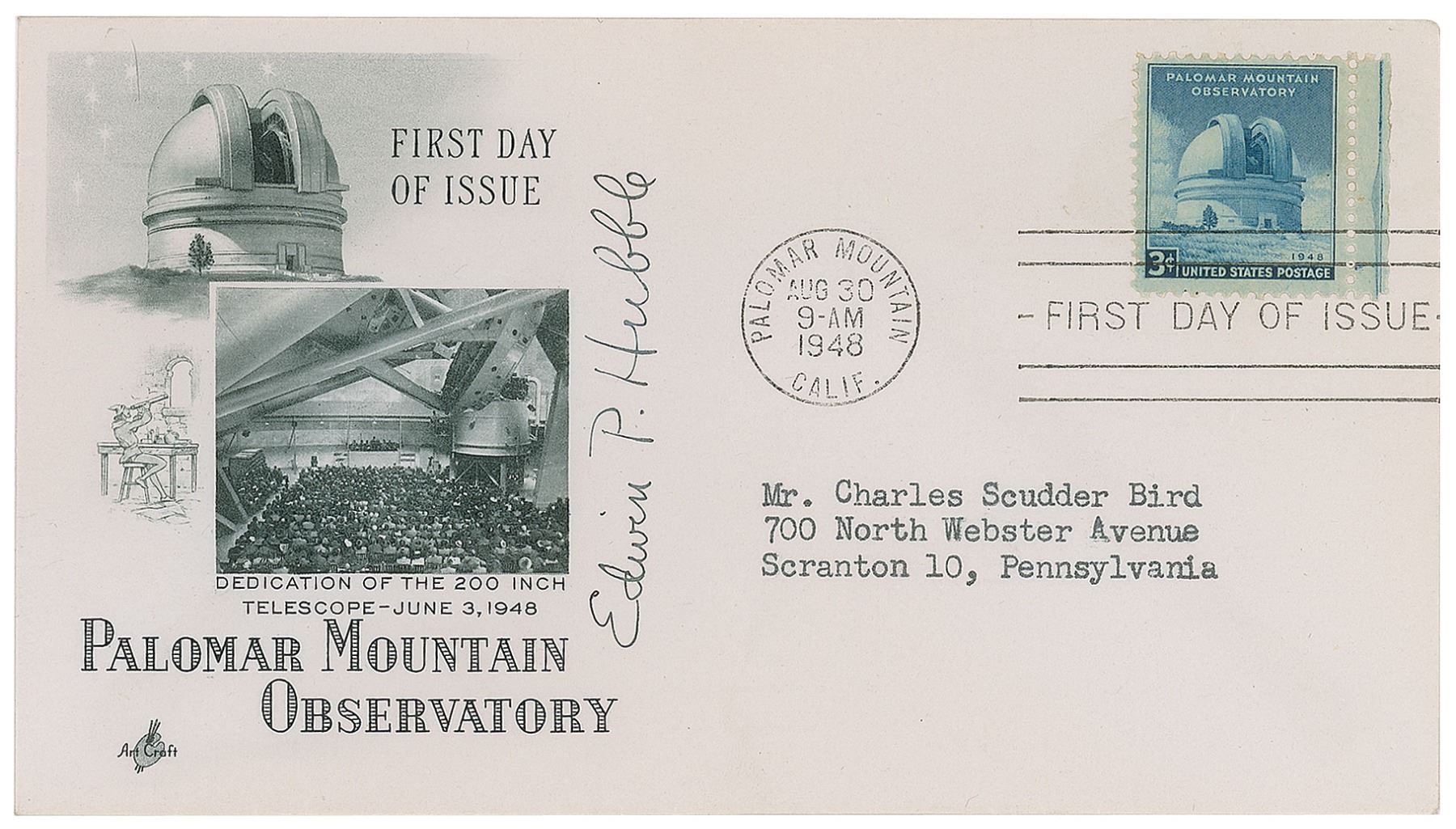 Very desirable FDC with a cachet honoring the dedication of the Palomar Mountain Observatory, postmarked at Palomar Mountain on August 30, 1948, signed vertically in fountain pen, "Edwin P. Hubble." In very fine condition.