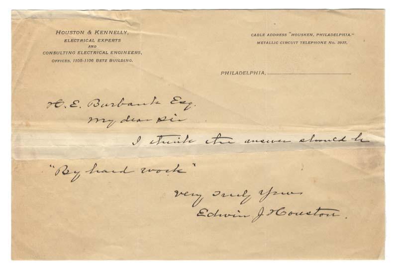 BY HARD WORK!! EDWIN J. HOUSTON (1847-1914). American electrical inventor. Autograph Letter Signed, "Edwin J. Houston," on Houston & Kennelly, Electrical Experts and Consulting Electrical Engineers letterhead. One page, 8" x 5 ¼". Philadelphia. No date Houston writes: "My Dear Sir, I think the answer should be "By Hard Work" Very Truly Yours, Edwin J. Houston."With Elihu Thomson, Houston designed an arc-light generator. In 1879, the two established the Thomson-Houston Electric Company. Twenty-two years later this company merged with the Edison General Electric Company to become the General Electric Company. It should also be noted that Kennelly was chief assistant to Thomas Edison. Fold marks, light age discoloring to center crease. Very Good.