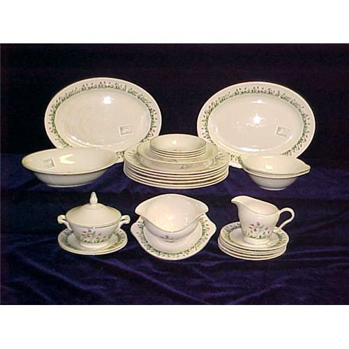 Edwin Knowles Rose - Assortment includes 6 dinner plates, 5 saucers, 2 bread & butter plates and 4 small bowls. Serving Pieces consist of cream & covered sugar, gravy boat with attached underplate, 2 oval platters, 1 oval vegetable bowl, 1 shallow round serving bowl and 2 medium bowls with handles.