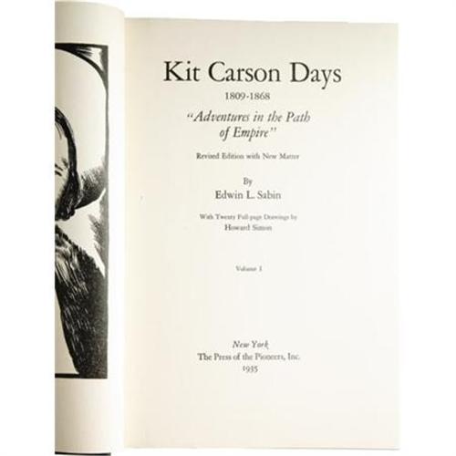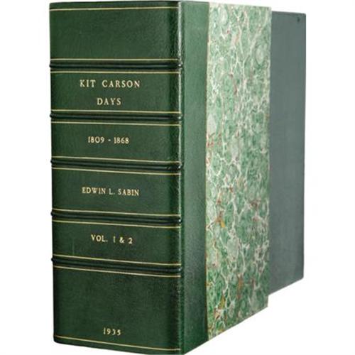 <B>Edwin L. Sabin: <I>Kit Carson Days 1809 - 1868</B></I></B></I> <I>Adventures in the Path of Empire.</B></I> (New York: The Press of the Pioneers, Inc., 1935), second revised edition, two volumes, 996 pages including Appendix, Notes, and Index, green cloth binding with gilt lettering on the spine and front board, 8vo (6.5" x 9.25"), glassine dust jackets covered with clear Mylar protective jackets. Contains 20 full page drawings by Howard Simon. Legendary Western author J. Frank Dobie called this biography of Kit Carson "A work long standard, rich in rendezvous, bears, and many other assorted topics." The version of Sabin's wonderful biography of Christopher "Kit" Carson presented here is much preferred to the 1914 first edition, expanding the narrative by adding over 300 pages of text and notes. The biography's author, Edwin Sabin, was an Iowa newspaper reporter and popular historian who wrote dozens of general biographies on famous Western figures ranging from General George Custer to Calamity Jane. He even moved from his professional base of Chicago to Denver and then San Diego, California to be closer to the frontier West, living over two decades upon the land that and with the people who populated his literary landscape.<BR><BR>Kit Carson stands tall among the mythic figures of the American West. Like most other famous names associated with the West, Kit Carson's reputation today is based more on legend and fiction than anything he actually did. Carson was a trapper, guide, Mexican War and Civil War combatant, Indian fighter and more, but some of the tall tales surrounding Carson have only grown taller over the years, in no small part due to the gluttony of dime novels, songs, comic books, movies, and television portrayals that have celebrated him. Sabin's two-volume biography is a rare chance to read a serious scholarly treatment of Carson the man. The set presented here is in fine condition, save for the glassine dust jackets. The corners show barely noticeable rubbing, and there are a few dark thumbprints on the top edge of each textblock. The glassine dust jackets show noticeable edge wear, typical of the ephemeral nature of the thin material. The outer-most clear plastic protective jackets have prevented any further damage to the glassine. The interior textblocks are clean and bright, with each volume showing only mild discoloration of the endpapers and a previous retailer's blind-stamp at the bottom of each front free endpaper. The binding is tight, and the presentation value stunning on this beautiful set of Sabin's <I>Kit Carson Days.</B></I> The set comes housed in its original green cloth slipcase and is further protected by a newer custom quarter leather slipcase with gilt lettering and five raised bands on the spine. This custom slipcase fits over the original slipcase, and further protects this grand biography of The Fighting Trapper.<BR><BR><b>Shipping:</b> Books & Catalogs (<a target="_blank" href="http://www.heritageauctions.com/common/shipping.php">view shipping information</a>)