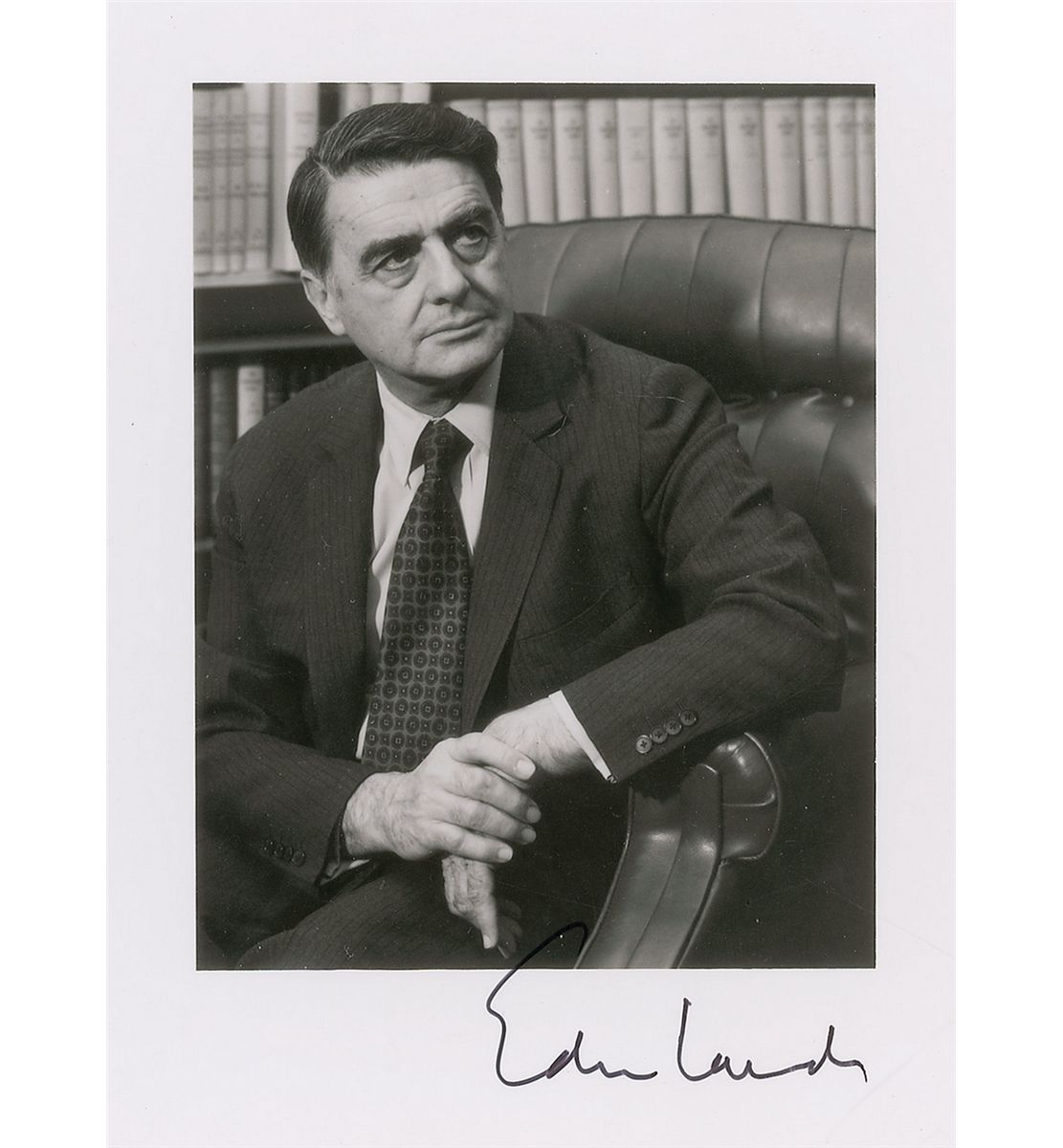 American scientist and inventor (1909–1991) who pioneered inexpensive polarizing filters and, with his development of ‘instant’ photography, built his company, Polaroid, into an industry giant. The innovation would lead Land to become the richest scientist in the world. Rare glossy 4 x 5.5 photo of Land seated in a leather chair, signed in the lower border in black felt tip. In fine condition.