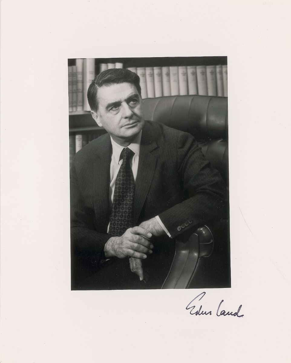 Rare glossy 8 x 10 photo of Land sitting in a chair, signed in black felt tip. Reverse bears an affixed photo caption. In fine condition, with slight brushing to the signature and a faint paperclip impression to top edge.