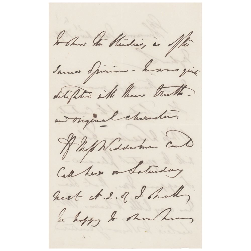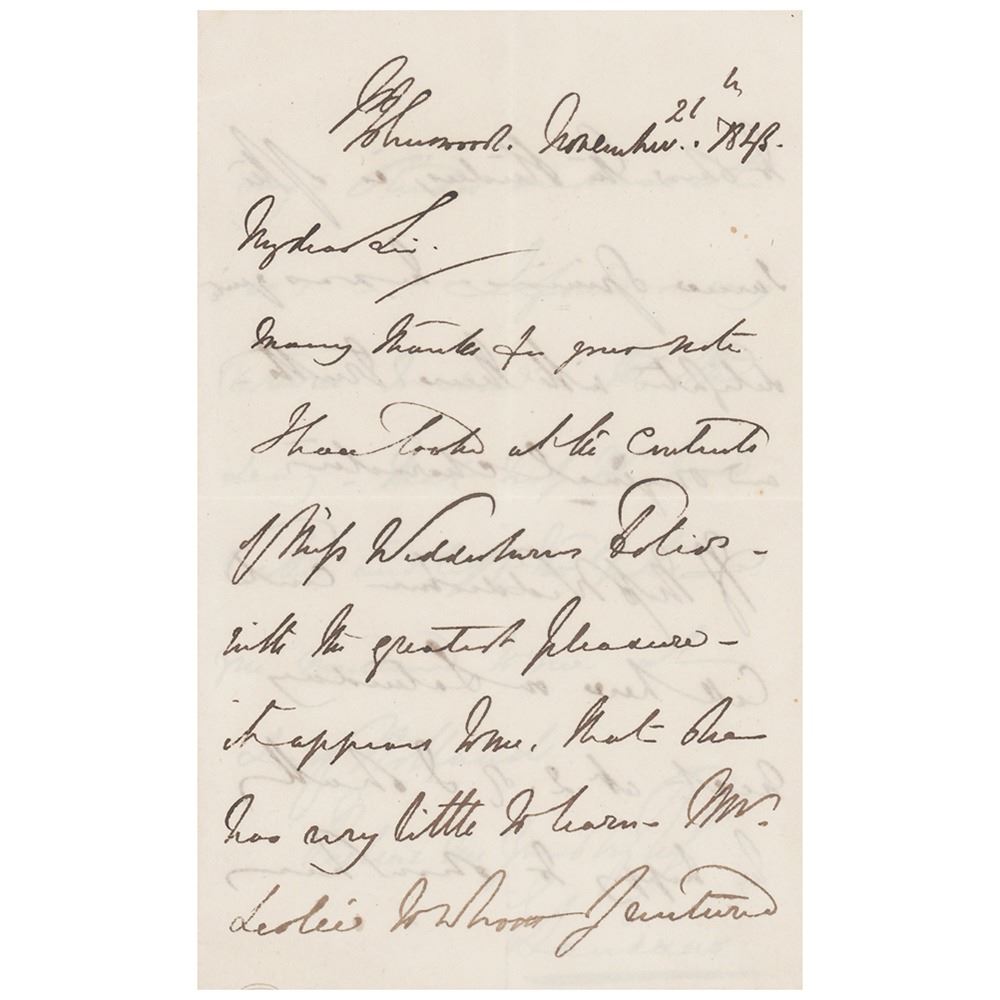 ALS signed ‰ÛÏE. Landseer,‰Û three pages on two adjoining sheets, 4.25 x 7, November 21, 1845. Letter commenting on another artist's folio, which he has looked at "with the greatest pleasure‰ÛÓit appears to me that she has very little to learn. Mr. Leslie‰Û_is of the same opinion‰ÛÓhe was quite delighted with their truth and original characters." He goes on to invite the artist to call, as he "should be happy to show her my studio." In fine condition.