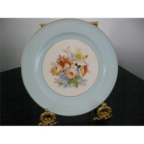 This Gorgeous plate is in color of baby blue decorated and hand painted with flowers in vibrant colors. Two circular gold painted border and is in excellent condition. Base has logo of the Semi Vitreous stamped with Edwin M. Knowles China Co. Made in U.S.A. 41-3. It is gorgeous and something to think about!