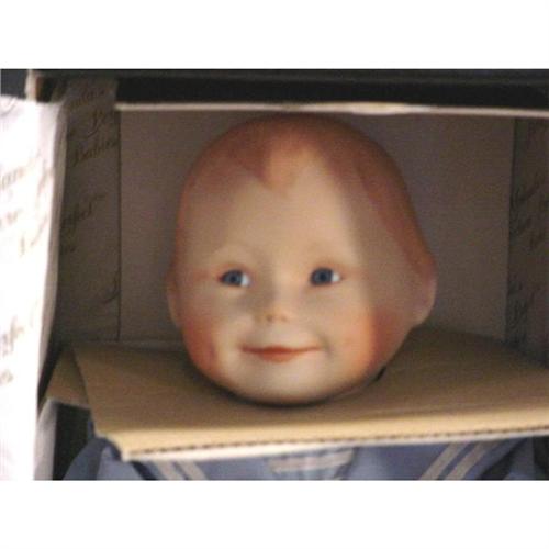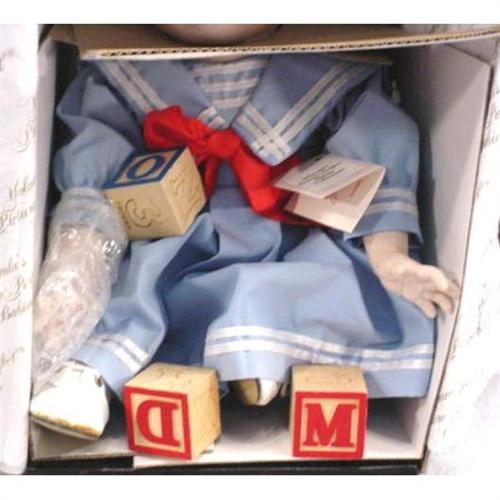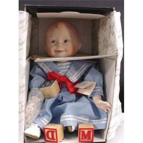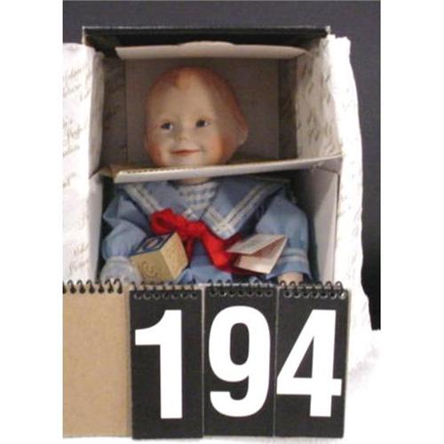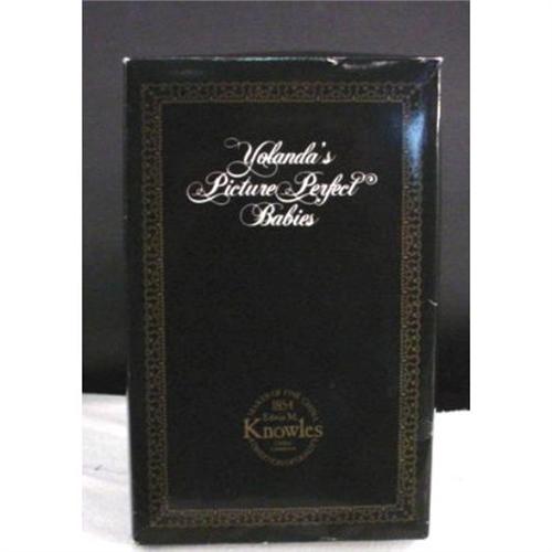 Porcelain doll from the Edwin M. Knowles China Company named "Amanda" by artist Yolanda Bello from "Yolanda's Picture-Perfect Babies" collection. Doll is in perfect condition and comes with accessories and red pillow for display. Doll measures 10 inches tall and weighs 2 lbs 2 oz. [81]