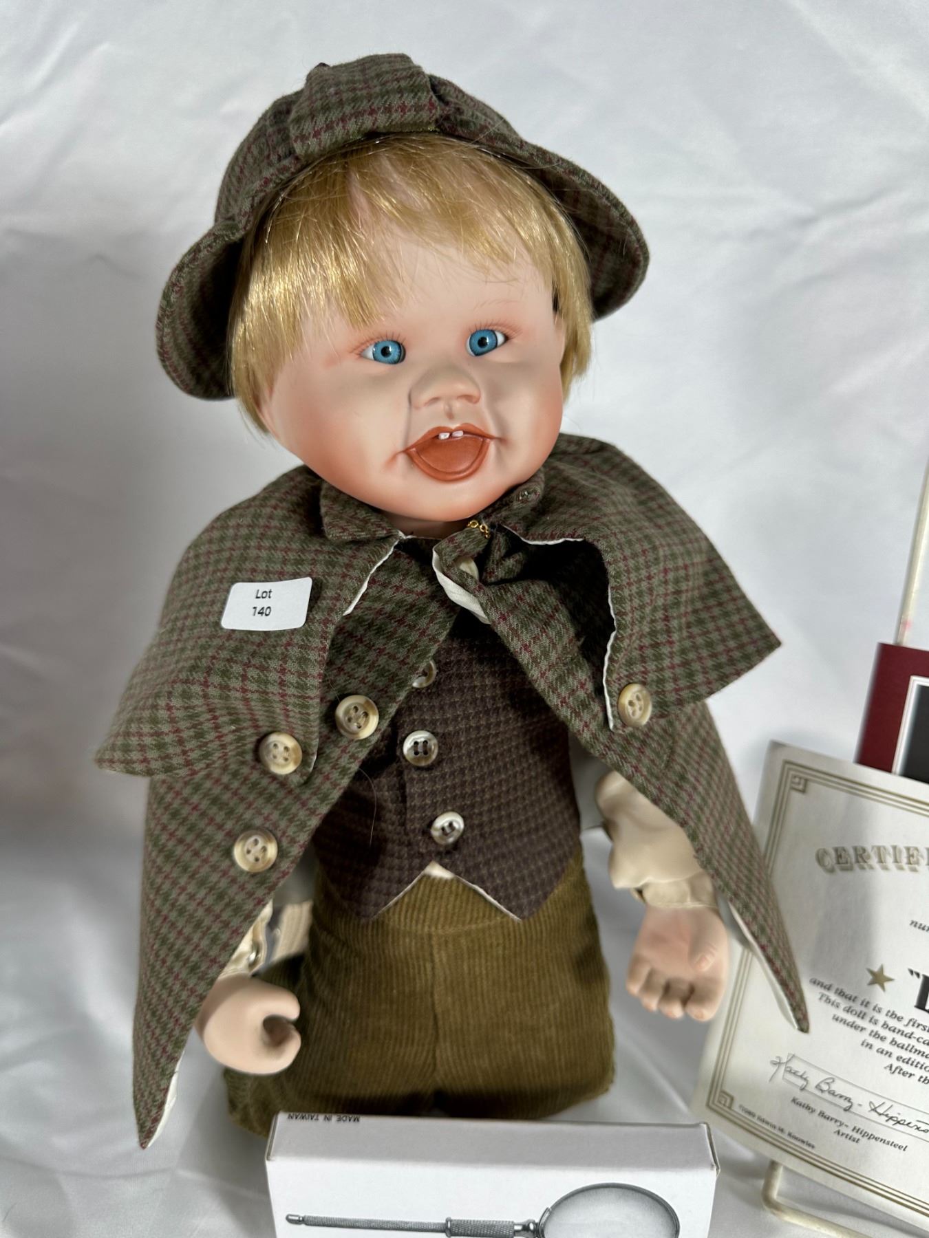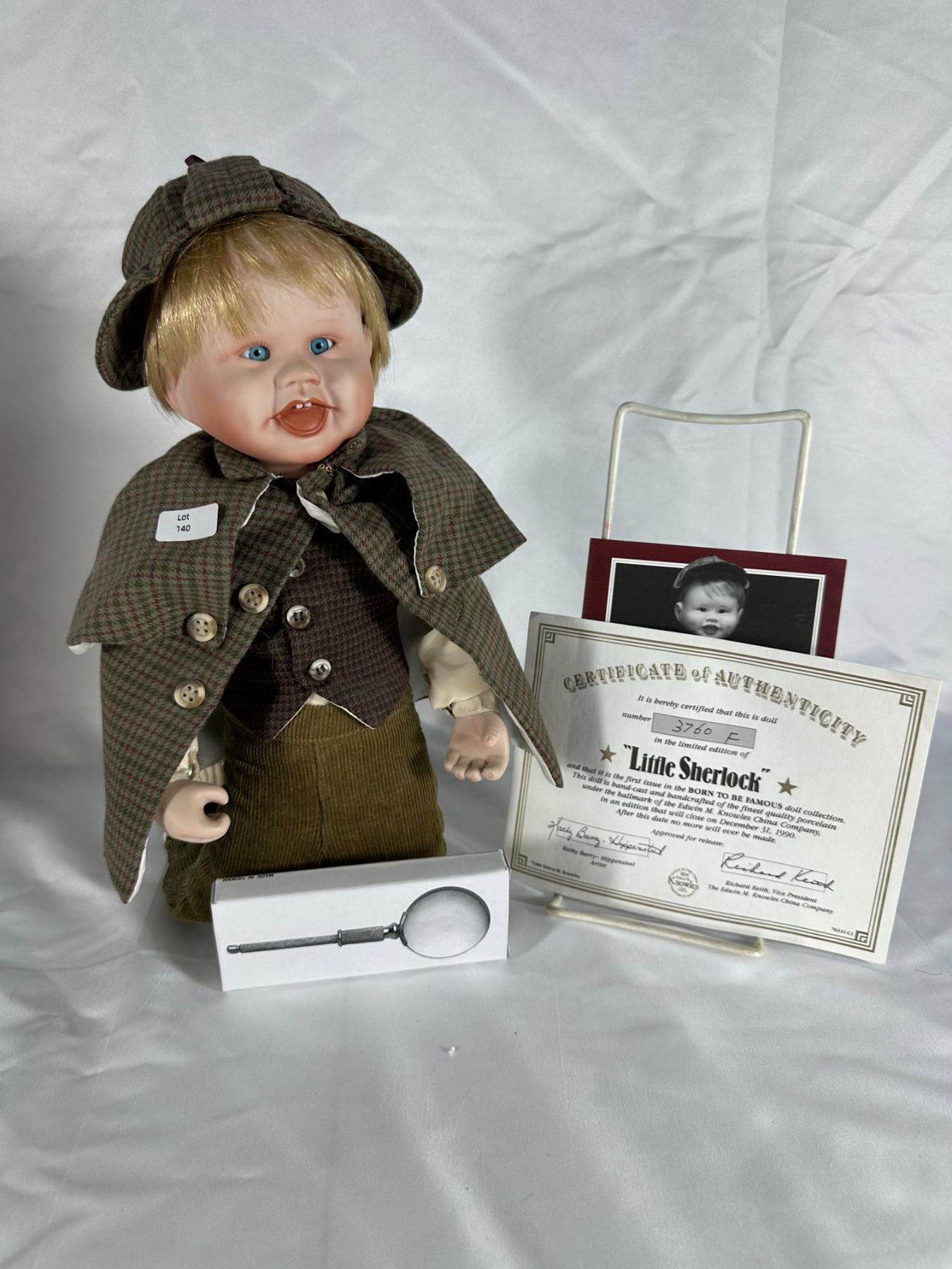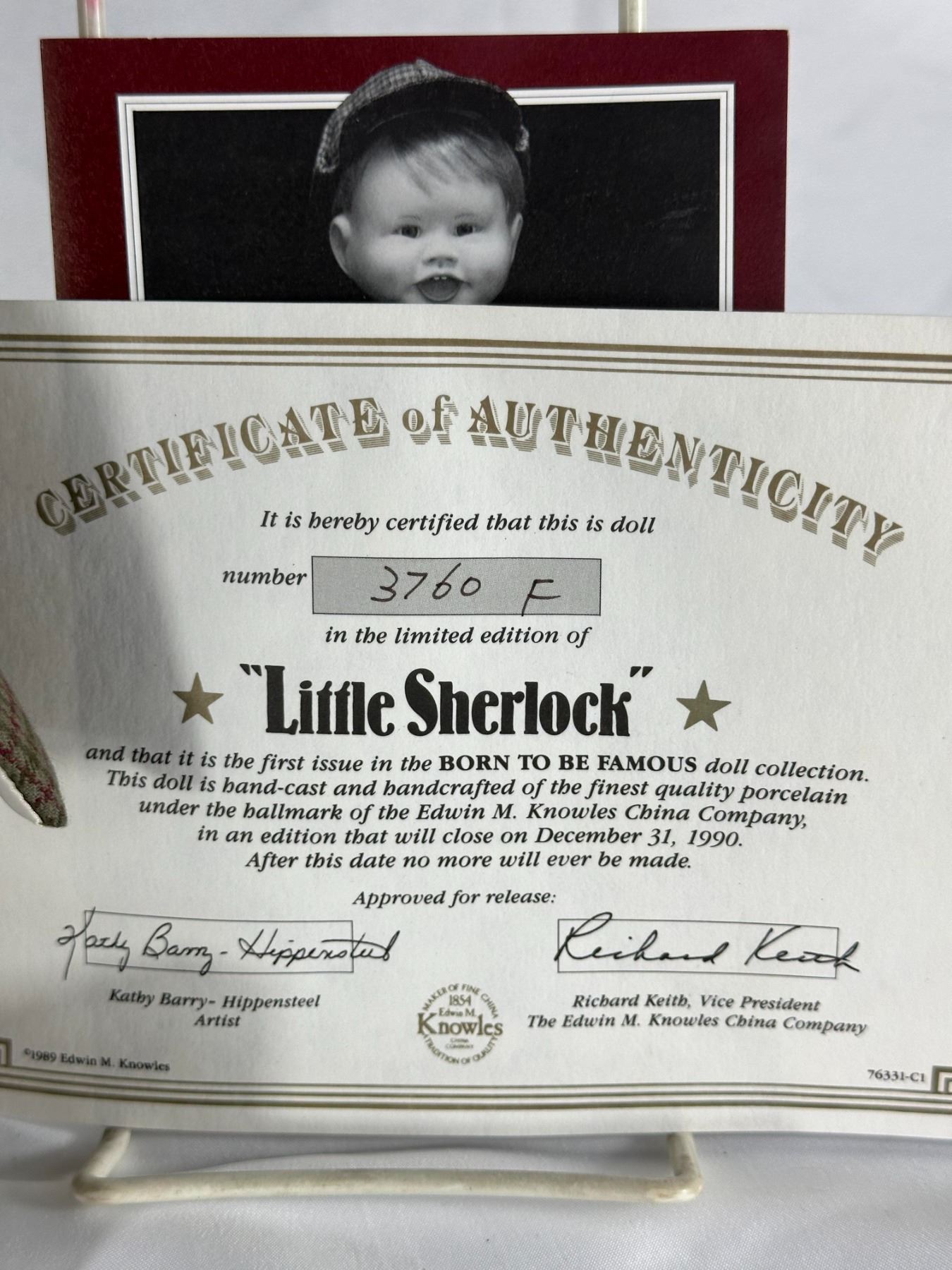 Doll *“Little Sherlock”* from Knowles’ *Born to Be Famous* series. Dressed in Sherlock Holmes-style outfit with deerstalker hat, plaid cape, vest, and corduroy trousers. Includes miniature magnifying glass and COA (edition 3760E).