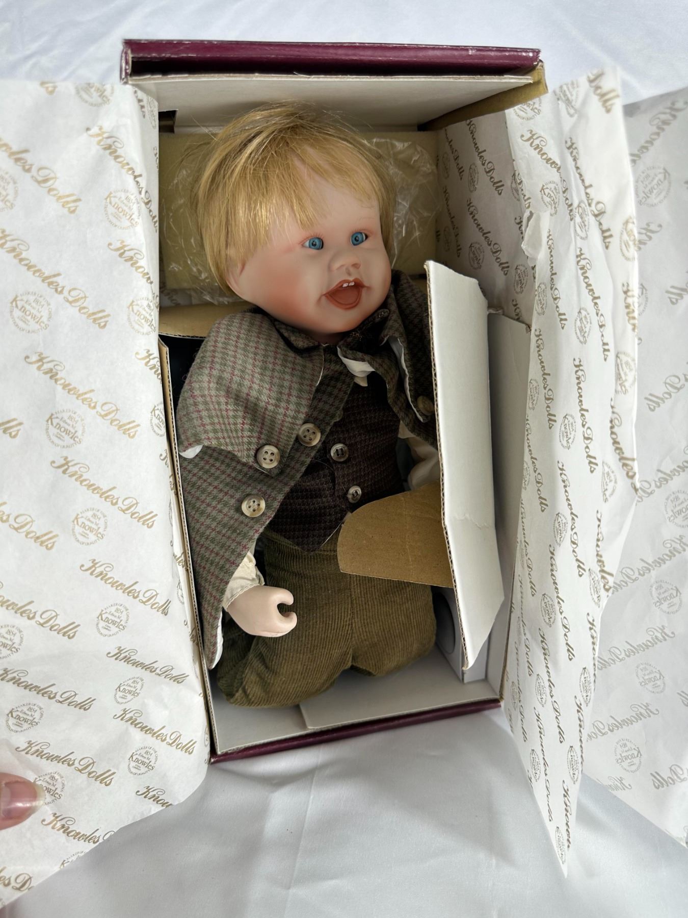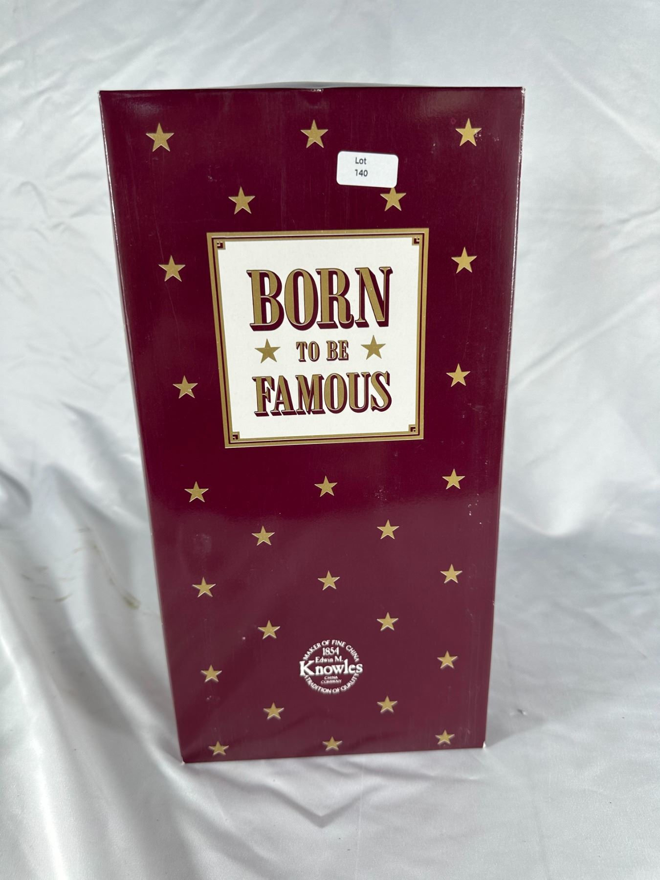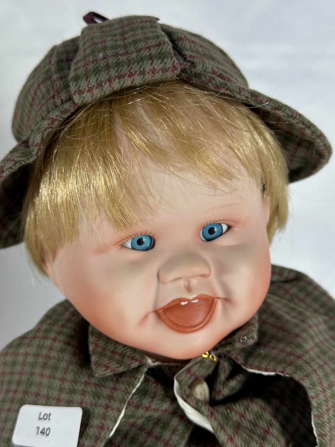 Doll *“Little Sherlock”* from Knowles’ *Born to Be Famous* series. Dressed in Sherlock Holmes-style outfit with deerstalker hat, plaid cape, vest, and corduroy trousers. Includes miniature magnifying glass and COA (edition 3760E).