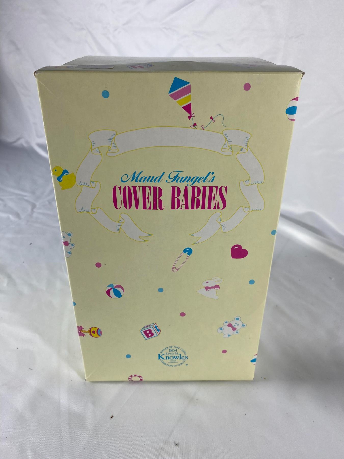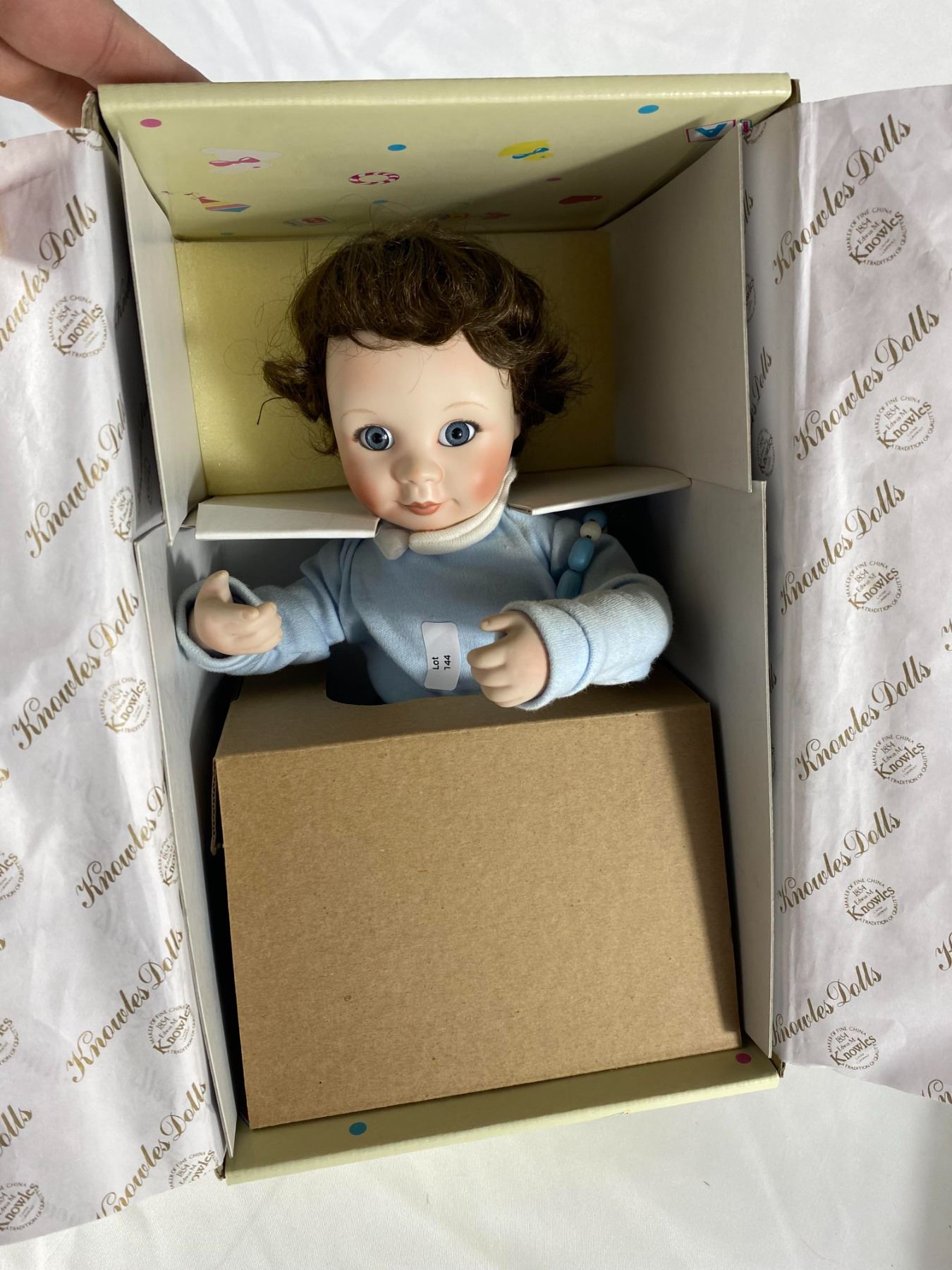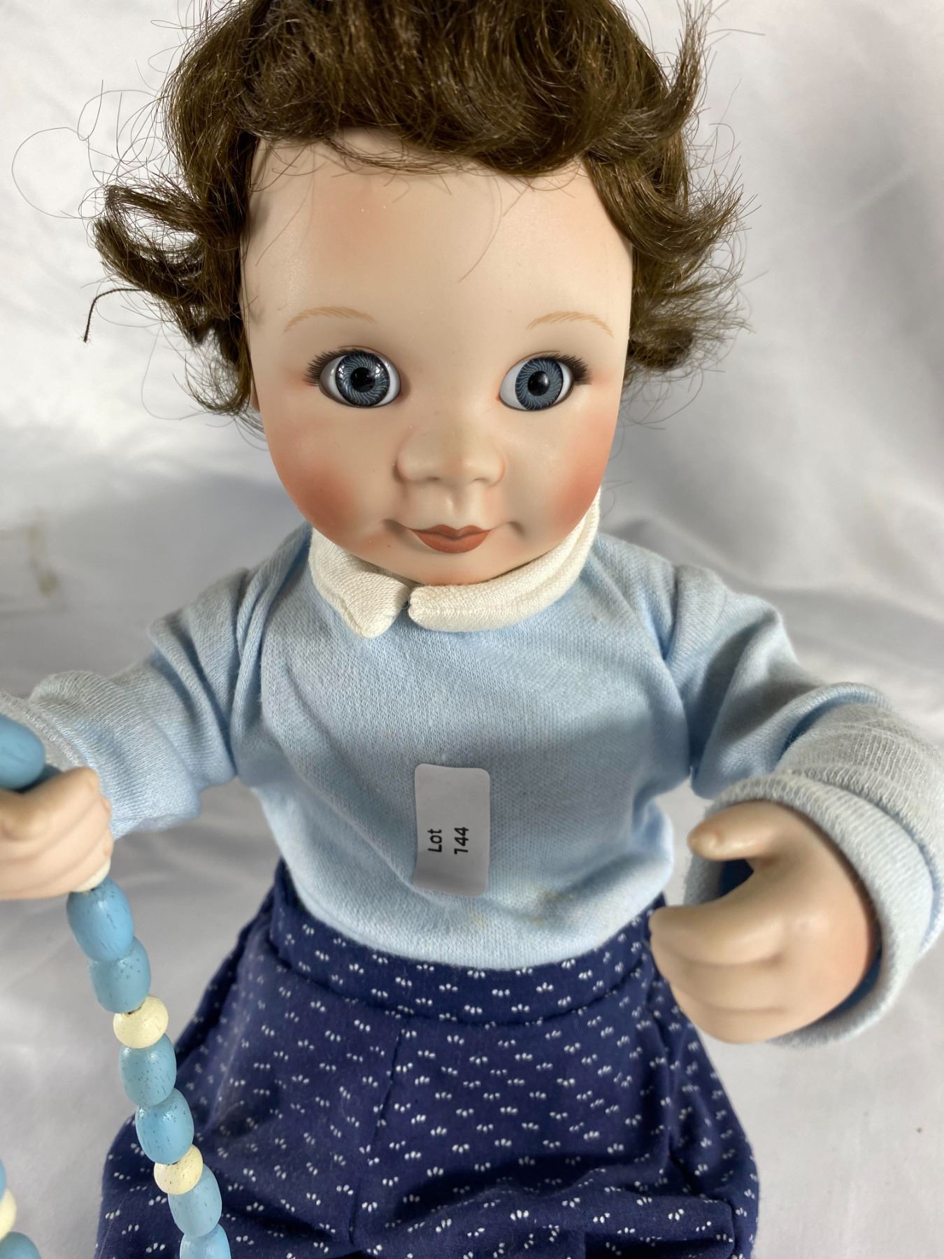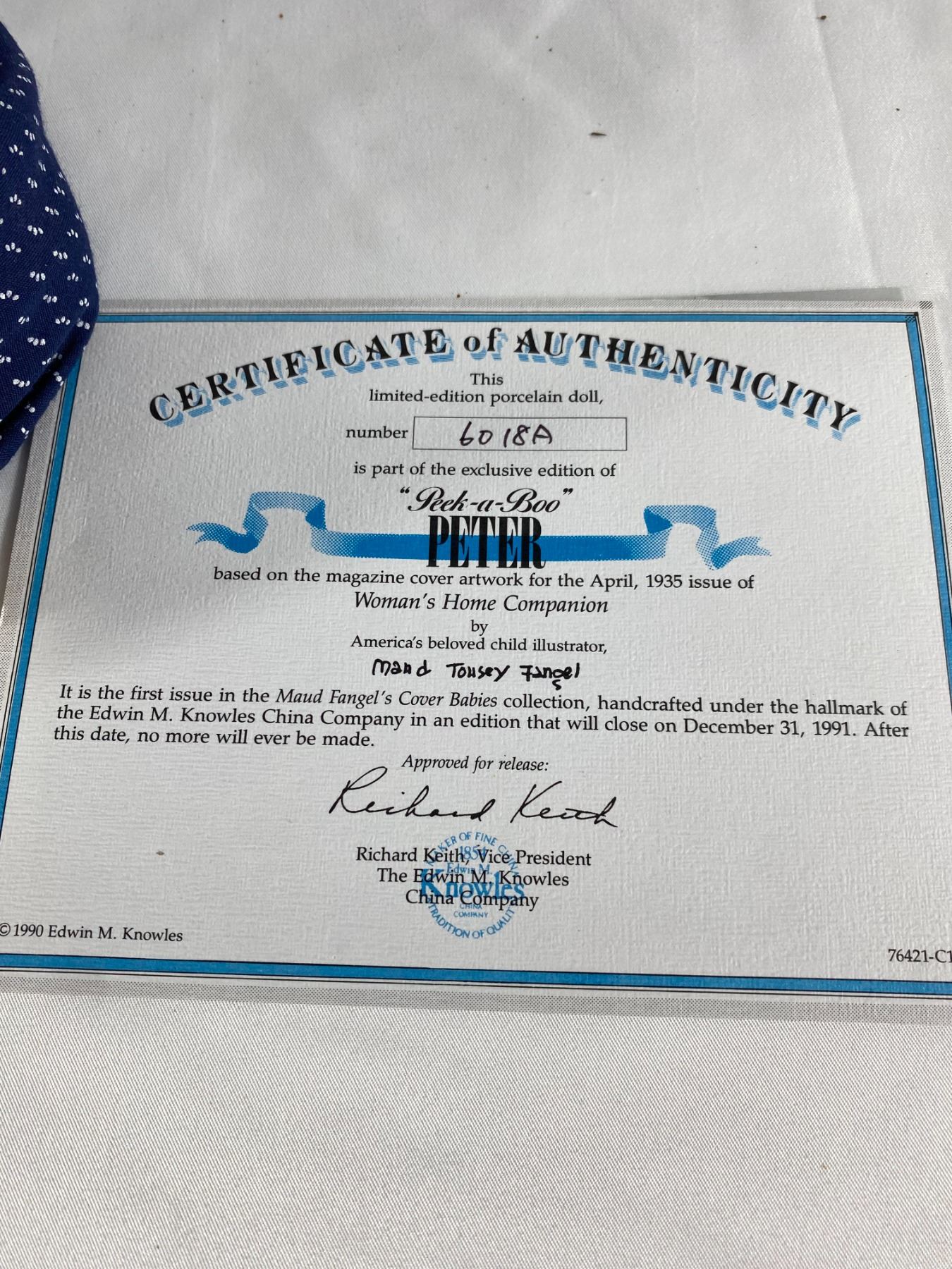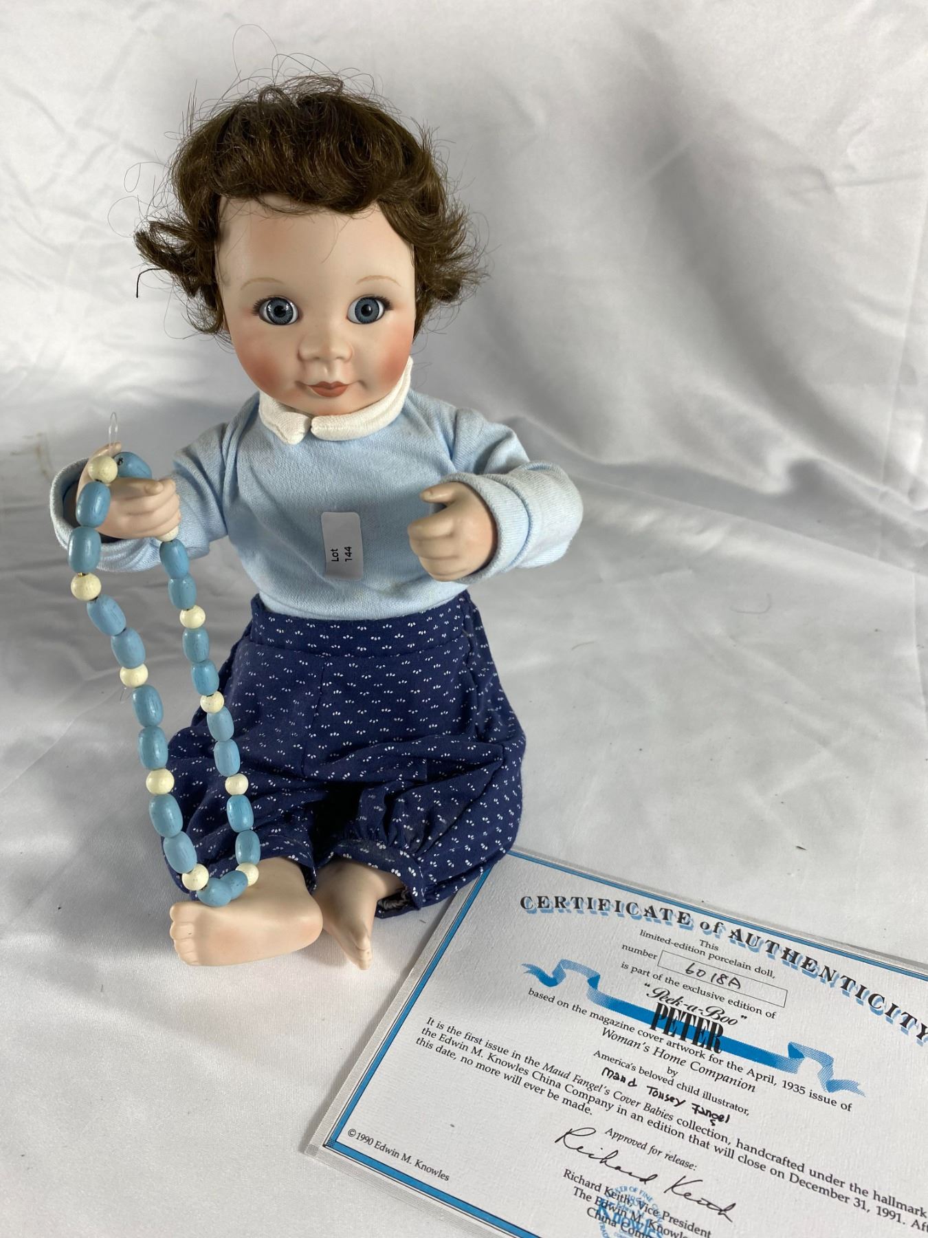 Porcelain doll *“Victor,”* first issue in the *1935 Woman’s Home Companion Cover Baby Series* by Edwin M. Knowles (1990). Features curly hair, blue eyes, blue shirt, patterned pants, and bead strand accessory. Includes COA (edition 6068B). Issued in 1990 as the first in the series, making it a notable and collectible edition.